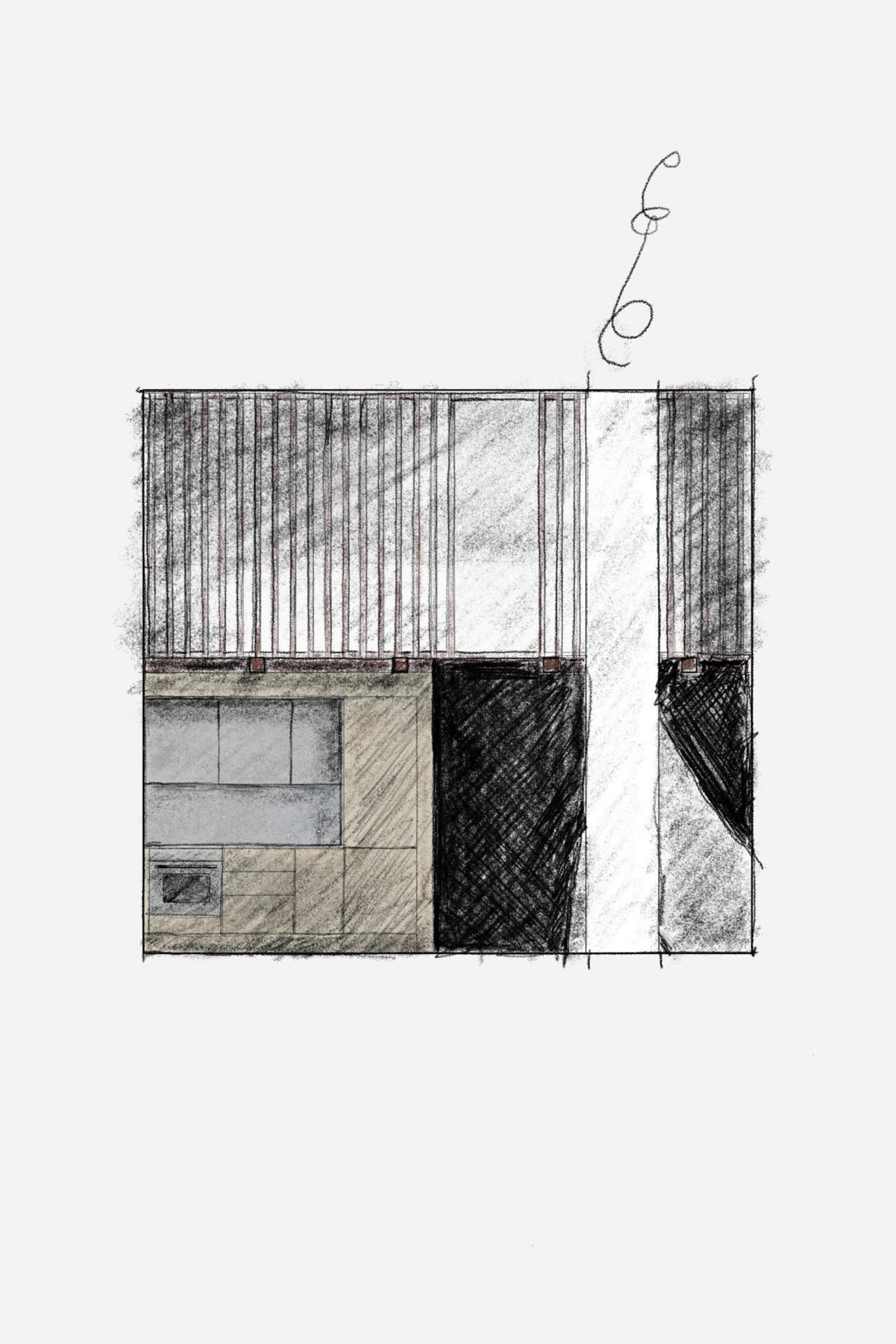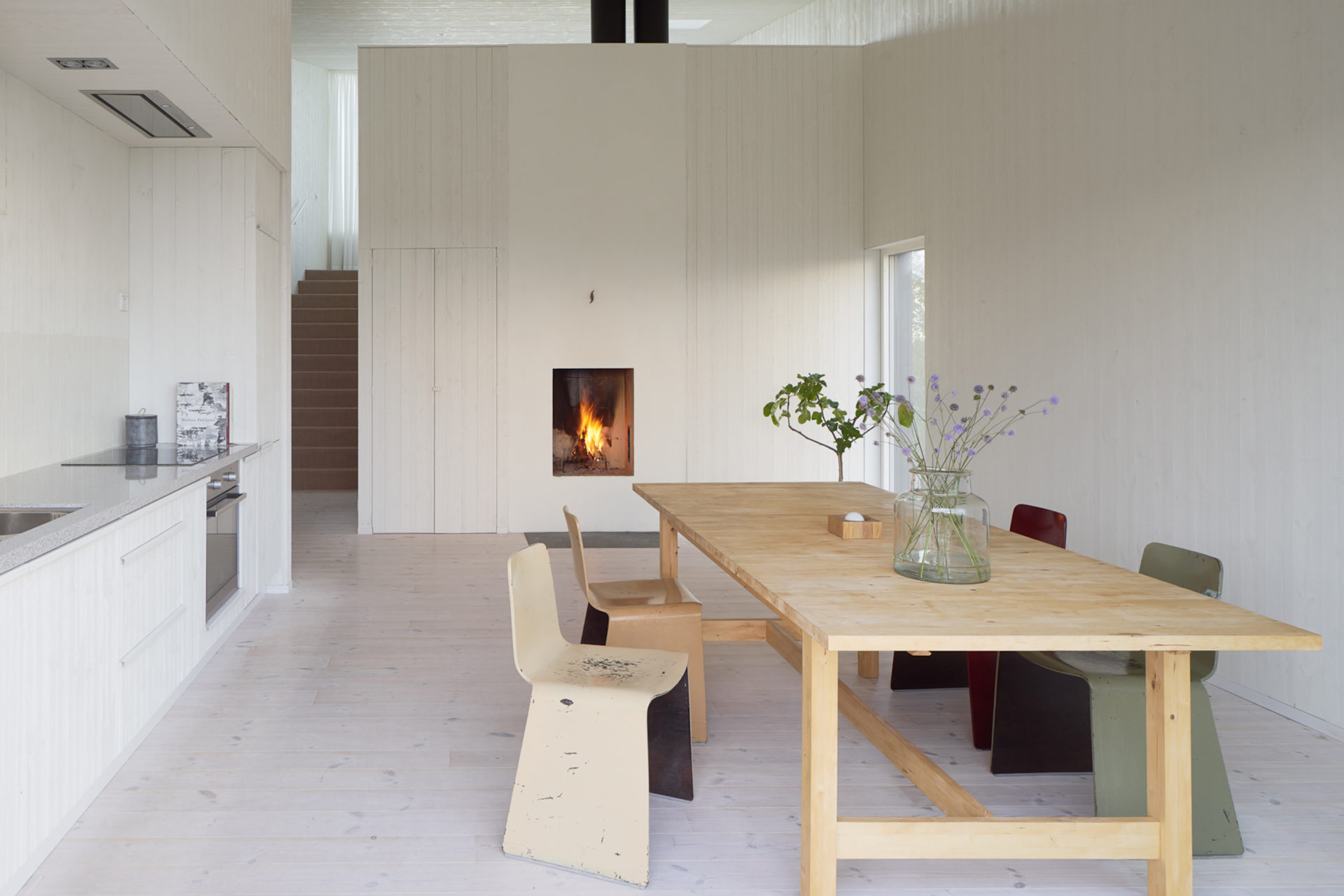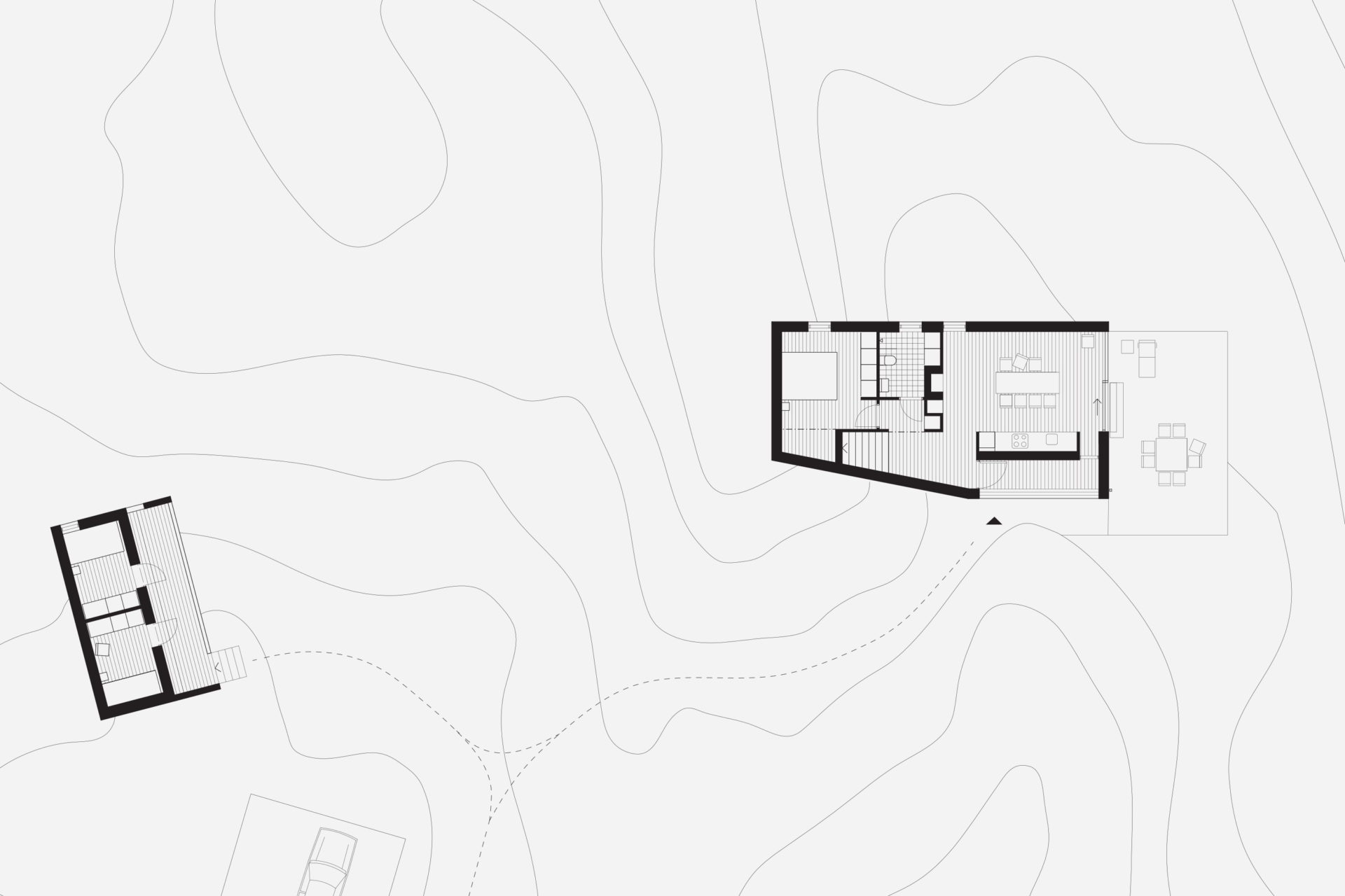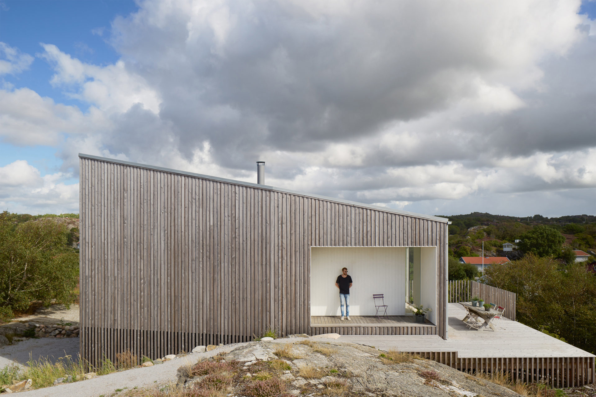 The characteristically barren and hilly terrain was the starting point for our discussion about the location. The possibilities were the deciding factor and the client bought the plot, 1 km from an old fishing settlement and 300 metres from the settlements northern inlet. Two buildings form a pair in a carefully chosen position. The site is up high but not high enough to see the strati from ground level. The terrain and the clients desire for a sea view decided the main building’s section with the upper floor adapted in height to afford a view of the strait. A smaller supplementary building forms a visual barrier towards the neighbours and defines the site boundary. The space between the buildings is taken in possession. The programme is in two parts: the larger house containing kitchen, living room, bedroom and bath and the smaller with two bedrooms for guests. The layout in the main building is based on the idea of gathering around fireplace and vista, an almost primitive layout. The chimney takes the centre point of the building with two fireplaces on top of each other. The living room with the top fireplace on one short side and view on the other, kitchen with the bottom fireplace and view in the opposite direction facing south. The window apertures afford a view of unspoiled nature only. Because of the clients interest in wood, it has been systematically used for structure, facade and interior surfaces. Wood has an unbeatable potential for in situation treatment, which the building’s contact with the ground demonstrates. The facade’s lid passes over the base and is carefully sawn just above the terrain. The buildings respond to the smallest movement and complete our deliberations about the site.