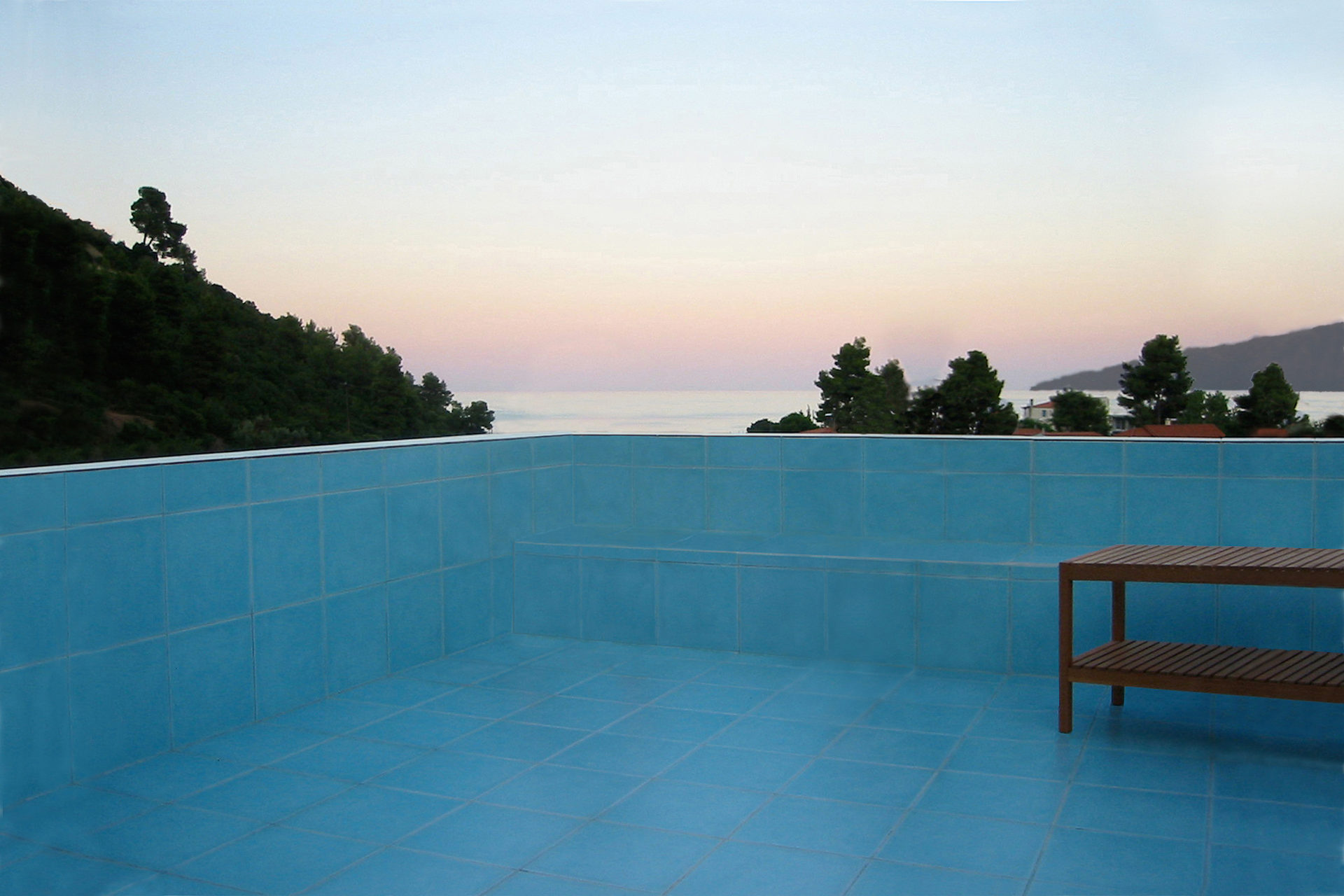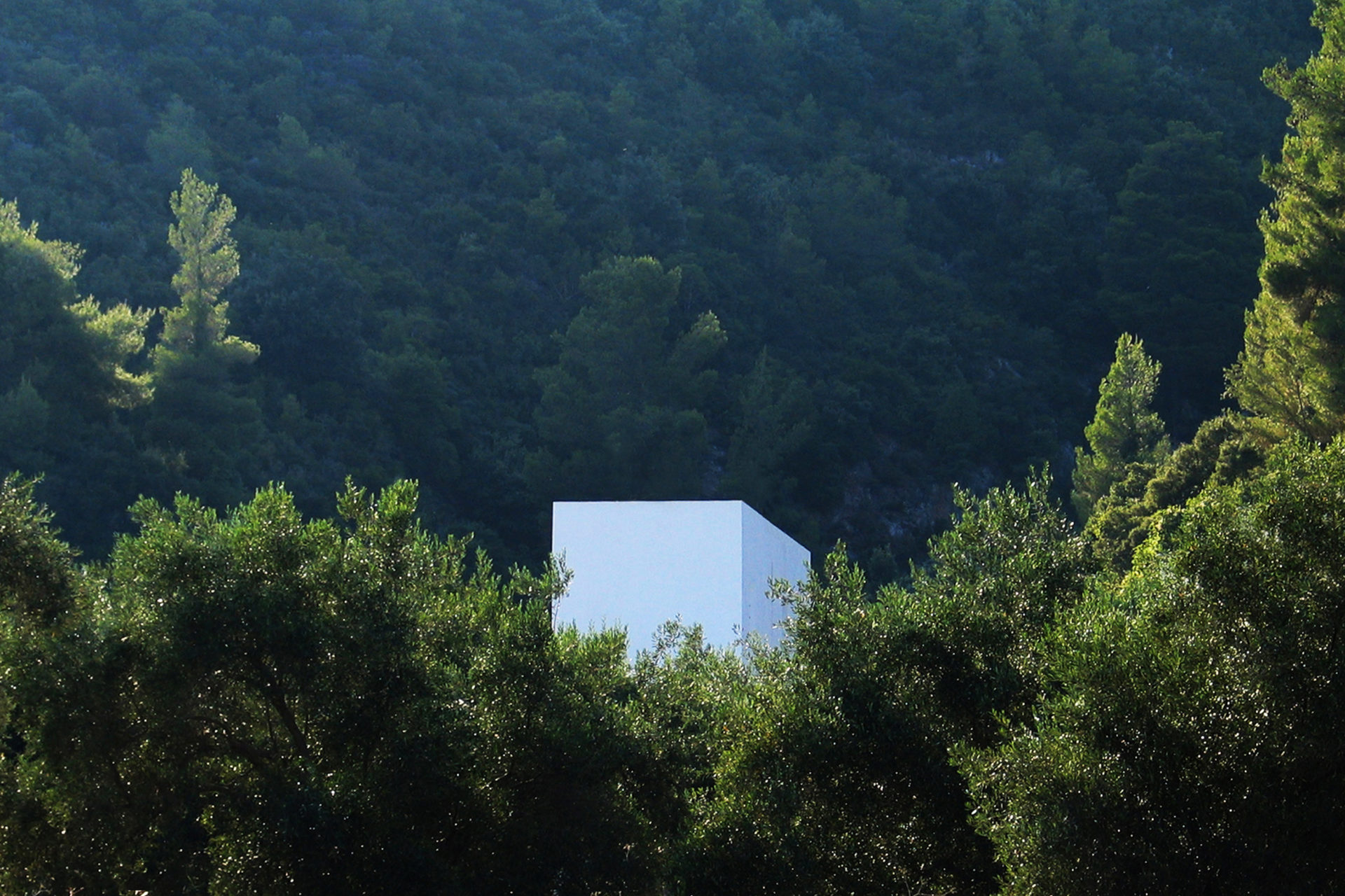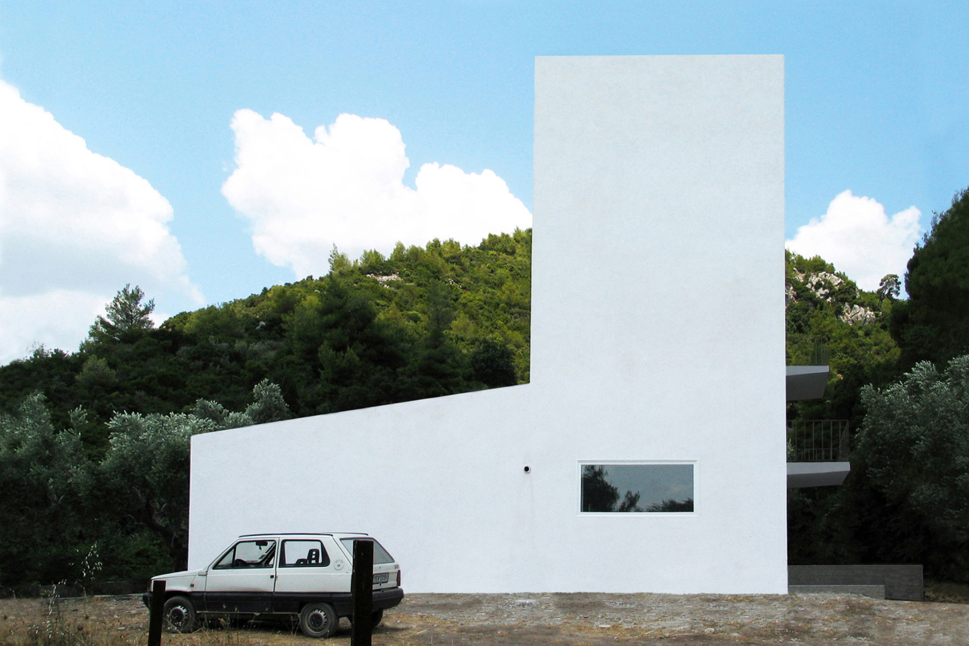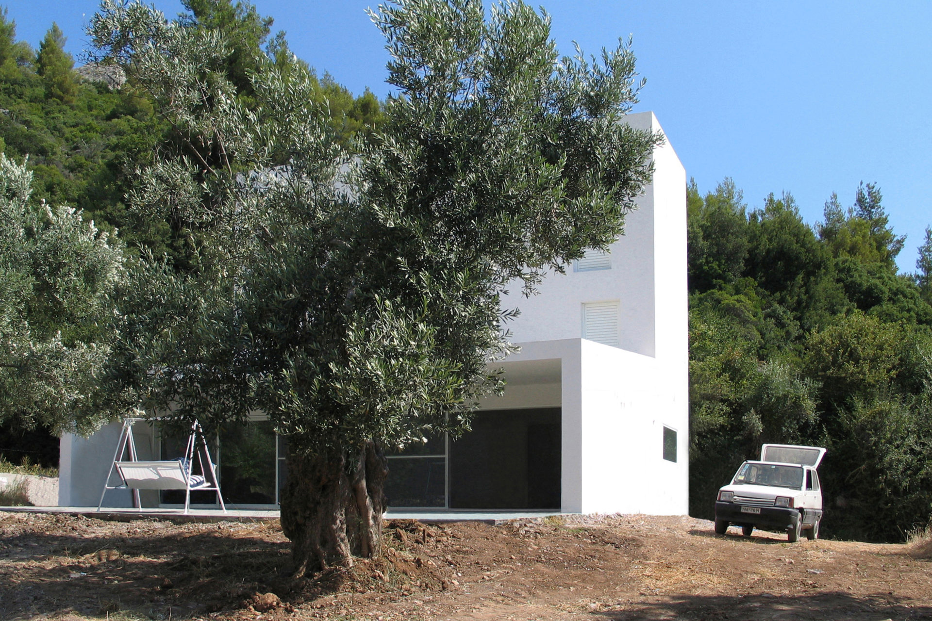 500 year old olive trees, a high ridge next door, and the Aegan Sea nearby, provided a distinct frame. To save trees, a small footprint was required and the result is a vertical building with common rooms on the entrance floor, and bedrooms on two floors above. The whole provides opportunities for family and guests to meet and to retreat in peace and quiet. Living room and kitchen are at ground level completely open towards the garden. Floors 2 and 3 are identical, each have two bedrooms and one bathroom. French balcony windows in opposite walls provide natural cross-ventilation. Despite the climate, mechanical air conditioning is not needed. A roof terrace delivers the finale in the relationship between the rooms and the trees: below, inside and above. Construction methods follow local traditions with cast-in-place concrete, whitewashed brick walls, and green slate floors. The house is a part of the village but stands in its surrounding agricultural landscape creating a gray zone where continued olive harvesting and summer life coexist. (finished during studies, 2002)