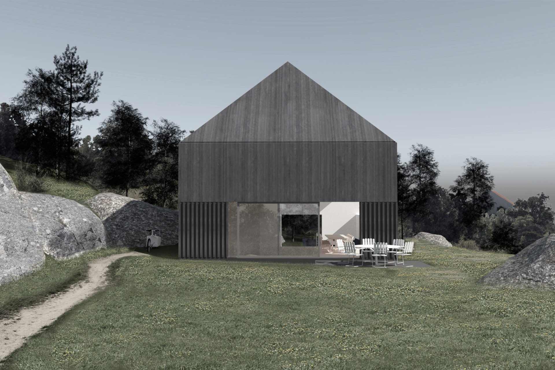What would be left of a newly built house in 3000 years? If it was built of wood and natural materials, perhaps only the remains of a stone staircase. The site’s 3,000-year-old rock carving from a prehistoric settlement raised these long term concerns as part of the founding strategy for the house. To achieve the greatest possible distance from the remains, the building was placed as far into the plot’s wedge as possible. The triangular property boundary became a mold for the house, and the internal is adapted to the external and the client’s wish for a total area of 200 sqm. With a foundation on pillars, the footprint would be minimal and the terrain in which the rock carvings had survived three millennia would not be lost. A stone staircase follows the slope to the level where the entrance hall naturally connects to the ground. The first floor comprises a large room with kitchen and living room and a window strip towards the entrance road and further on a horizontal landscape. Light conditions in the room vary greatly in relation to its varying depth of 1.5-10 meters. The second floor with four bedrooms and bathroom faces the private mountainside. The repetition of the smaller rooms runs efficiently along the longest side of the building and the complicated triangular shape that´s left is transformed into an asset as a double-height triangular void.