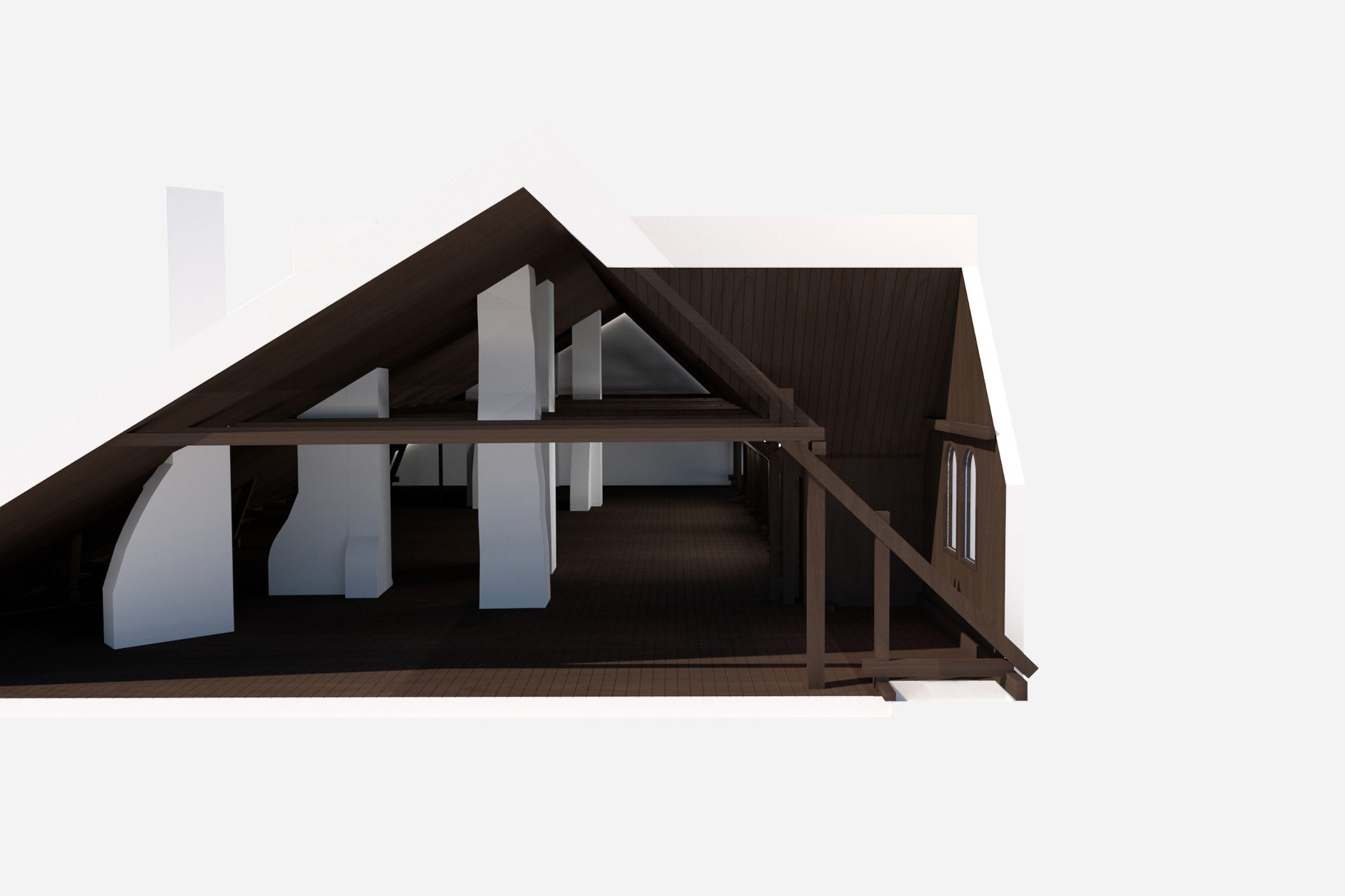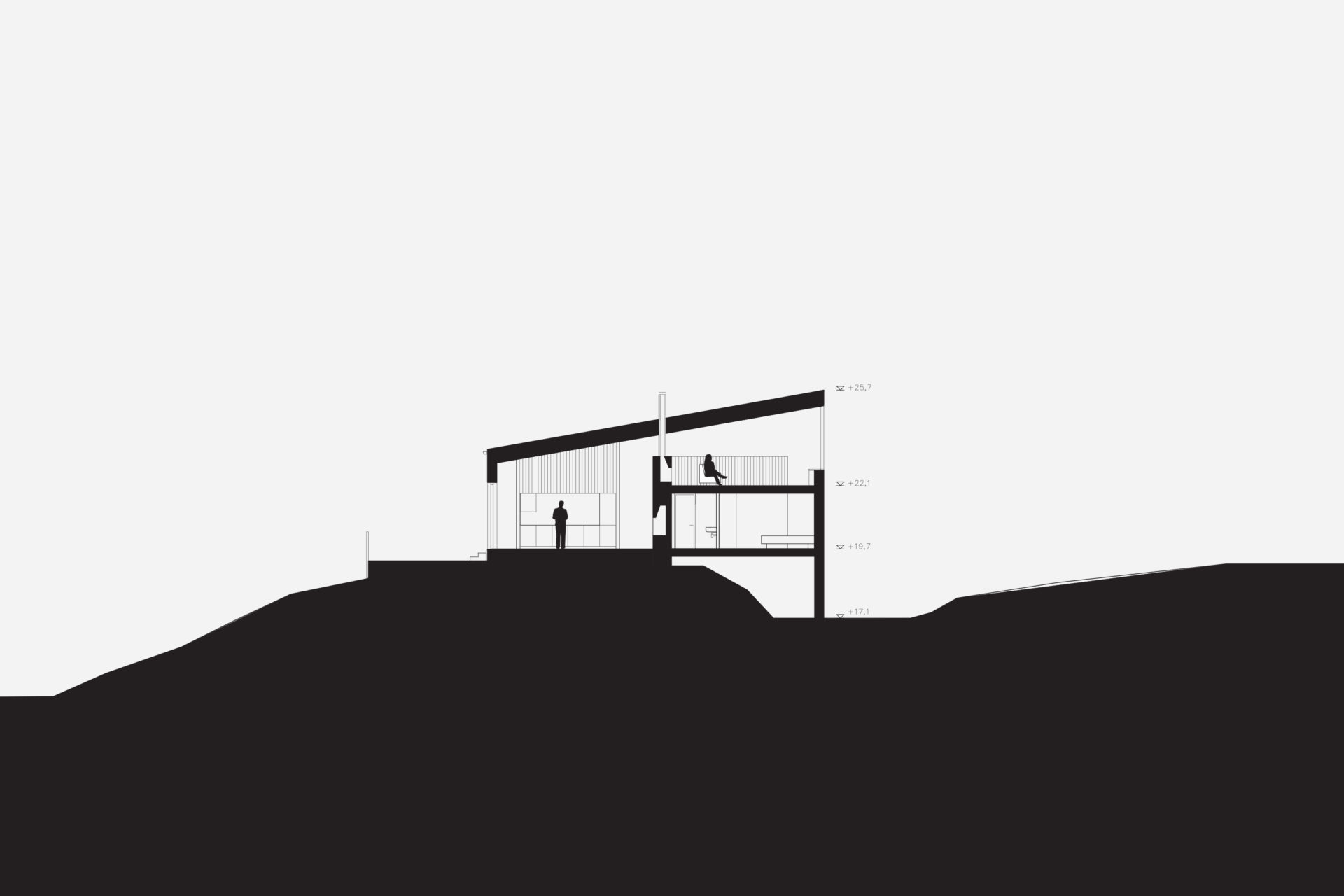 The house is located on the border between a flatter lower landscape and an elongated higher ridge. Like coarse pixels, the rooms on the ground floor are adapted to the plot’s high-resolution topography. Different functions are at different heights, but within the same space. The living room is at the bottom. On an intermediate level are the kitchen, entrance hall and bathroom. On an upper level, overlooking the nearest bay is the library/ guest room. With a ceiling at a constant level and floors at different levels, the room height varies greatly. The common functions naturally have the highest room height, and the adapted heights of the floor levels provide direct connections to the outside entrance area and terraces. The bright interior of the living room and kitchen and large varied openings towards three directions compensate for dark winter months based on the client’s partly southern European origins and longing for light. The top floor is another world. Separated from the other functions are three bedrooms and a bathroom arranged under a steep gabled roof, which provides typically cozy attic rooms. Wood is used consistently in frames, facades, and roof.