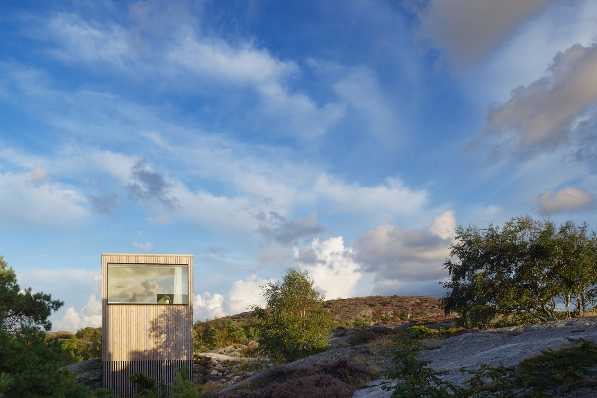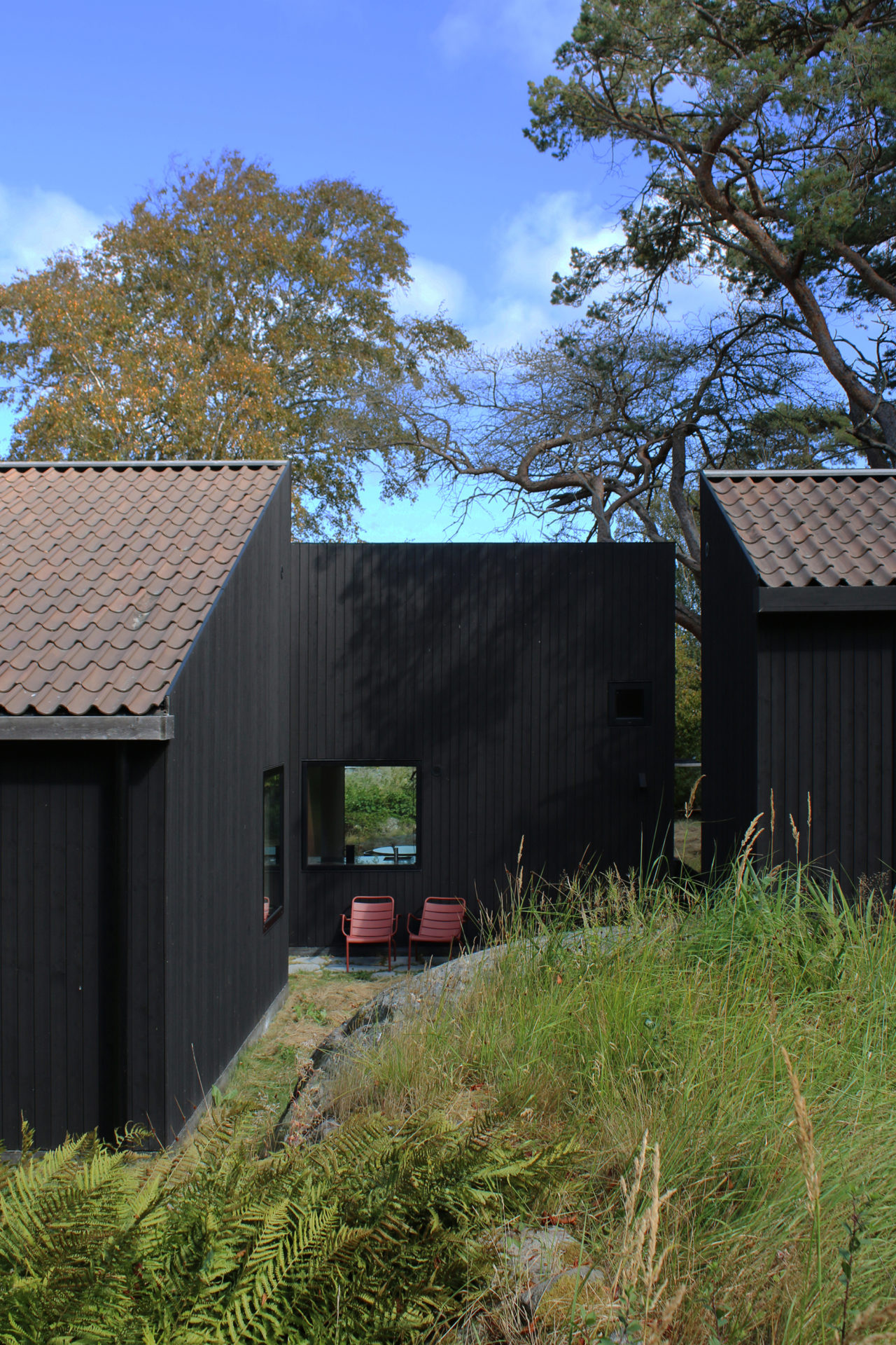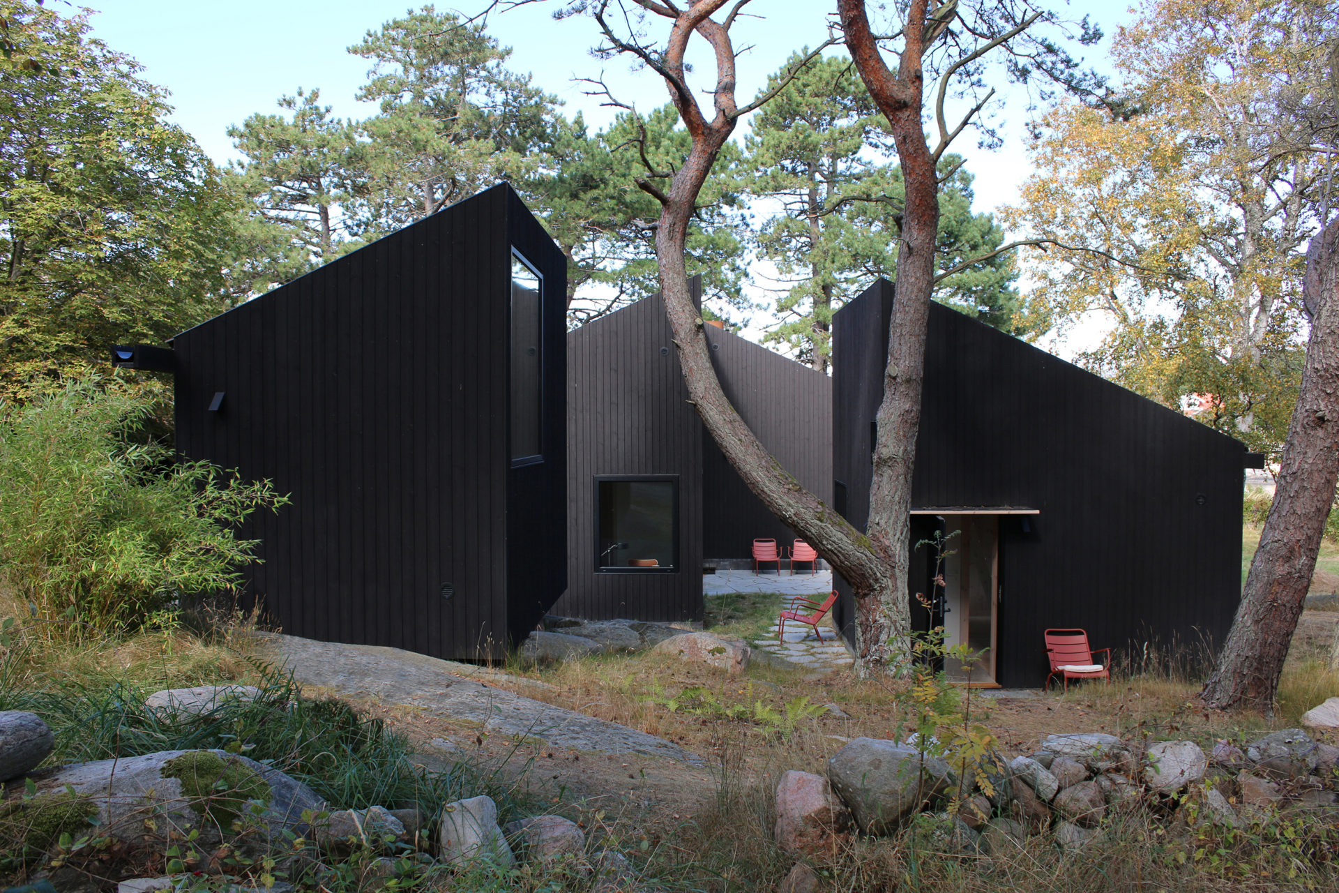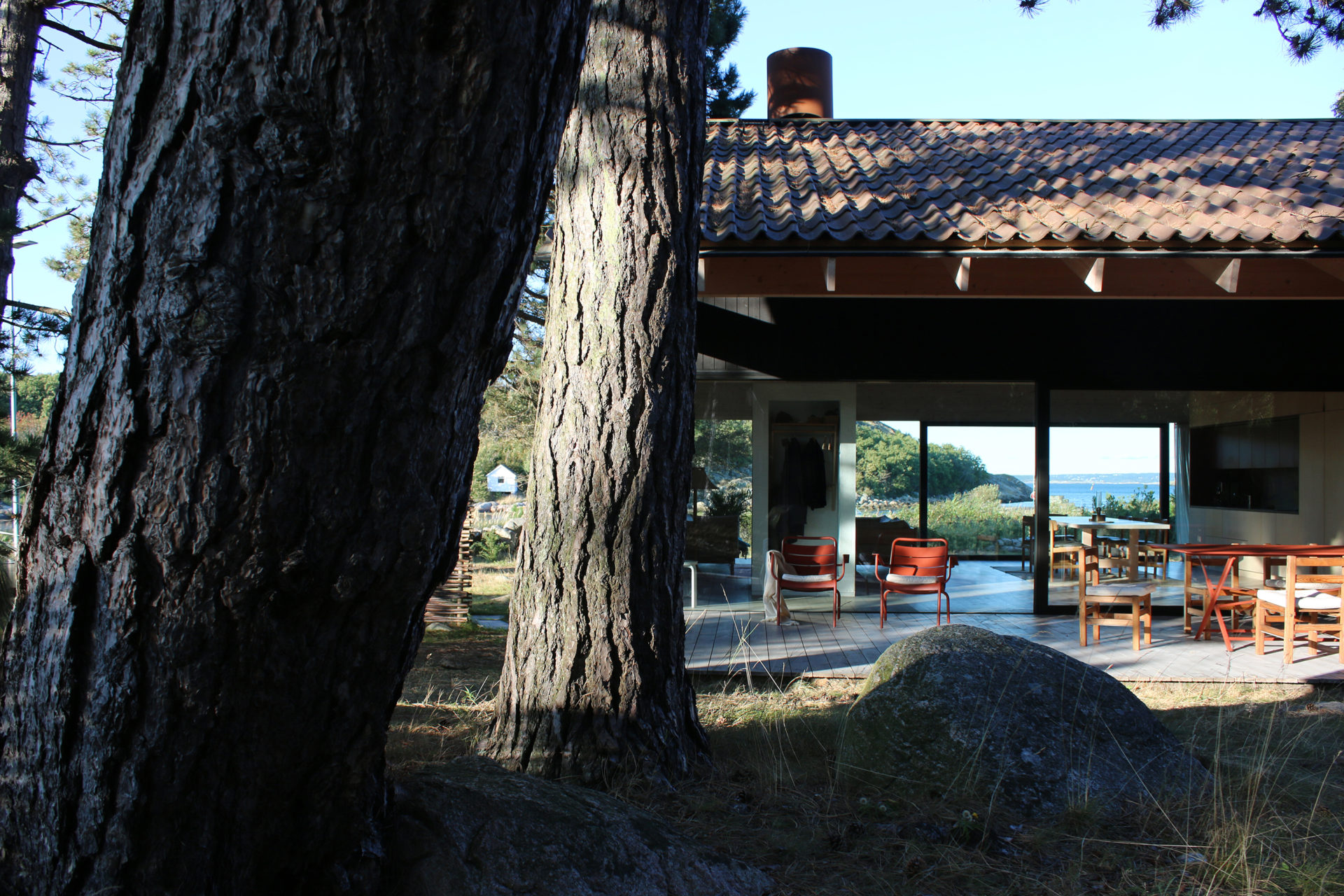A group of pines that grow with rare force give the place shelter from storms that sweep in regularly. Between the trees, four buildings are placed to seek sun shelter and views with a strategy where outdoor rooms are given equal care as the interior ones. The entrance, living room, kitchen, and terrace form a large transparent space, facing both the sea in the northeast and the evening sun towards the southwest. Serving functions are conversely closed, turned away from the sea. In the quietest position of the house is the master bedroom. The freestanding guesthouse is like a boat, all everyday functions are on a compressed surface independent of the other buildings. At the far end of the plot, in the most secluded location is the sauna. With a foundation on boulders found on site, the building takes a step up into the slightly sloping terrain. Between pines, in the protection of surrounding buildings, it scouts down towards the sea.