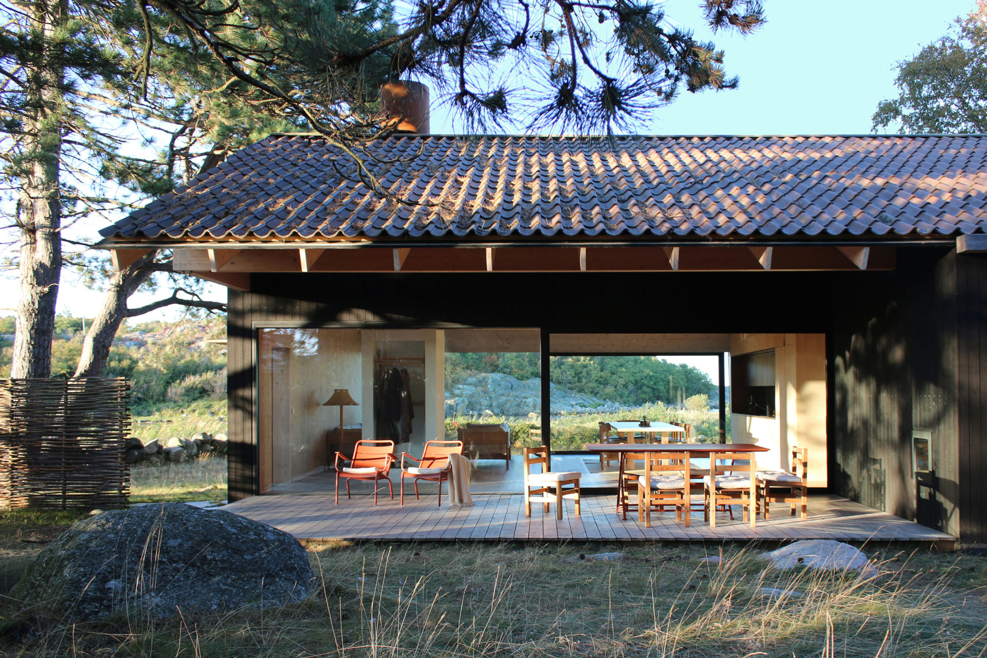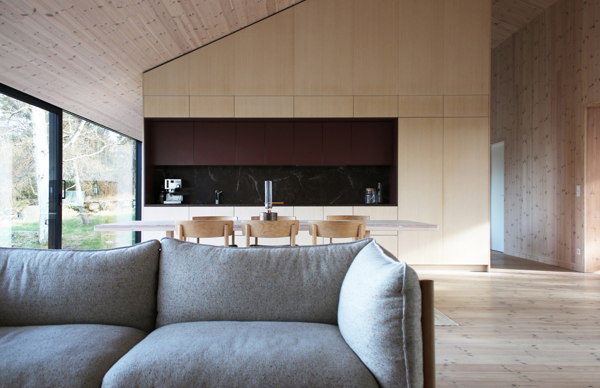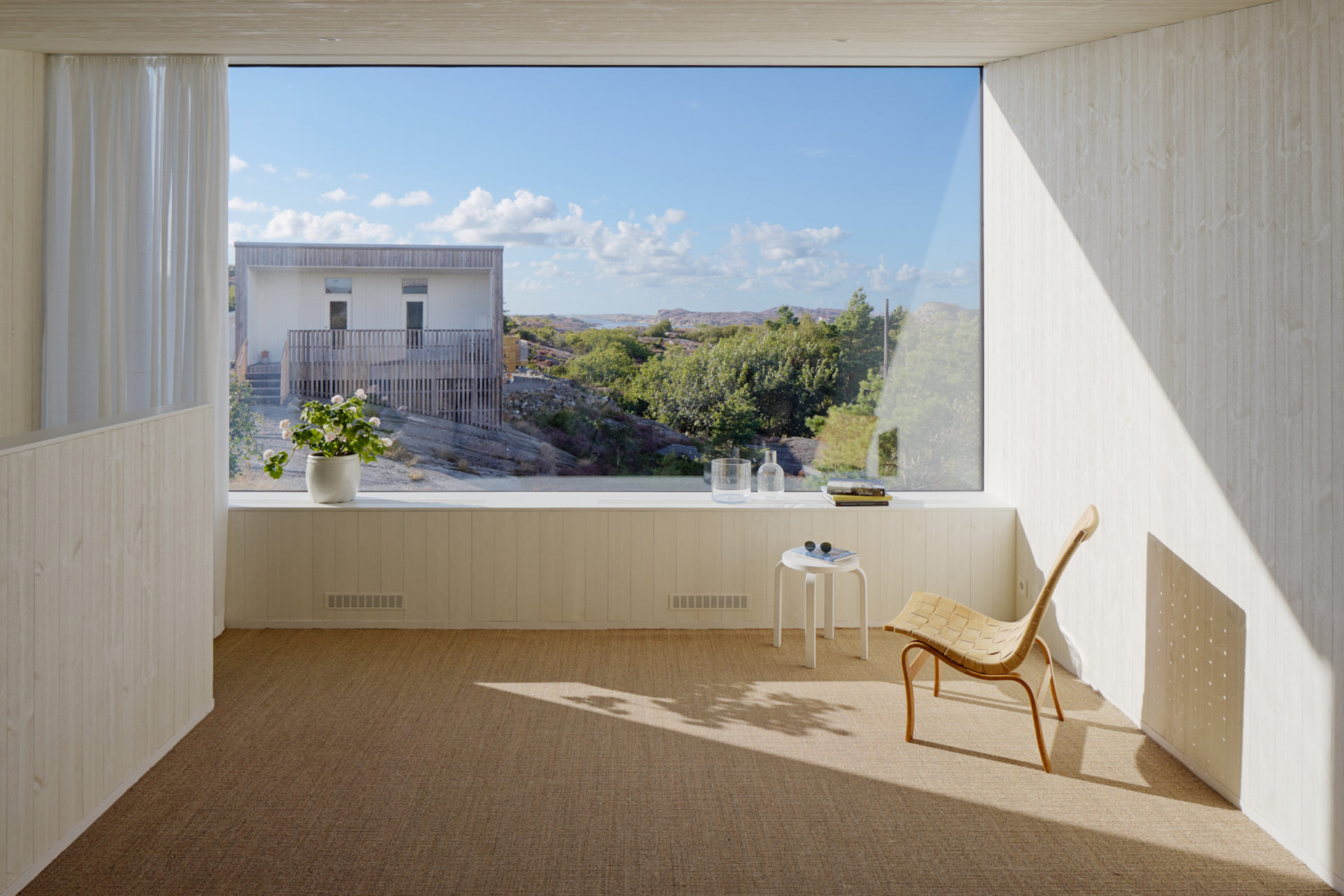 A group of pines that grow with rare force give the place shelter from storms that sweep in regularly. Between the trees, four buildings are placed to seek sun shelter and views with a strategy where outdoor rooms are given equal care as the interior ones. The entrance, living room, kitchen, and terrace form a large transparent space, facing both the sea in the northeast and the evening sun towards the southwest. Serving functions are conversely closed, turned away from the sea. In the quietest position of the house is the master bedroom. The freestanding guesthouse is like a boat, all everyday functions are on a compressed surface independent of the other buildings. At the far end of the plot, in the most secluded location is the sauna. With a foundation on boulders found on site, the building takes a step up into the slightly sloping terrain. Between pines, in the protection of surrounding buildings, it scouts down towards the sea.