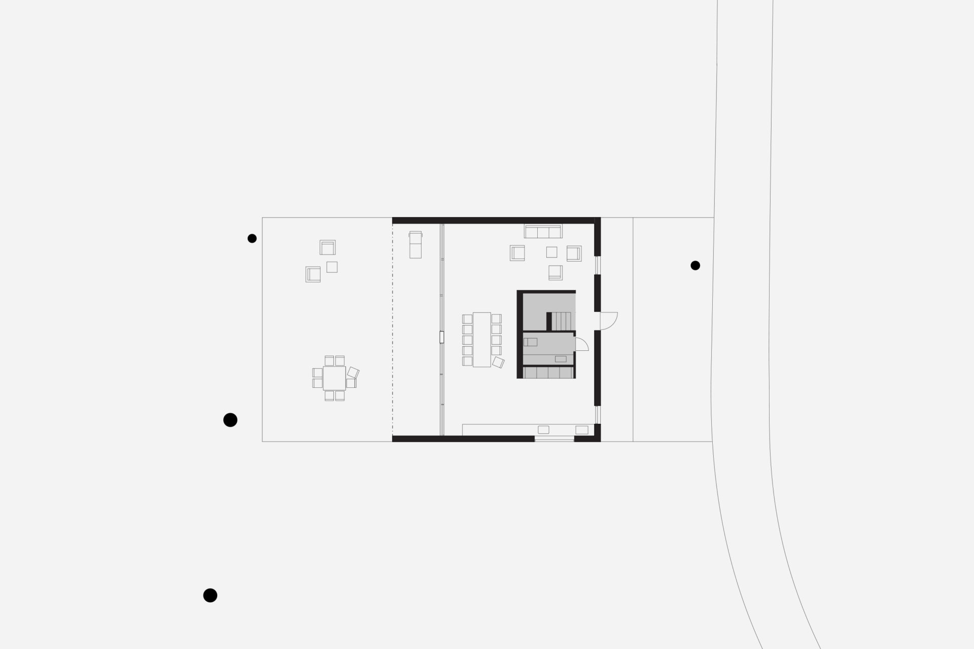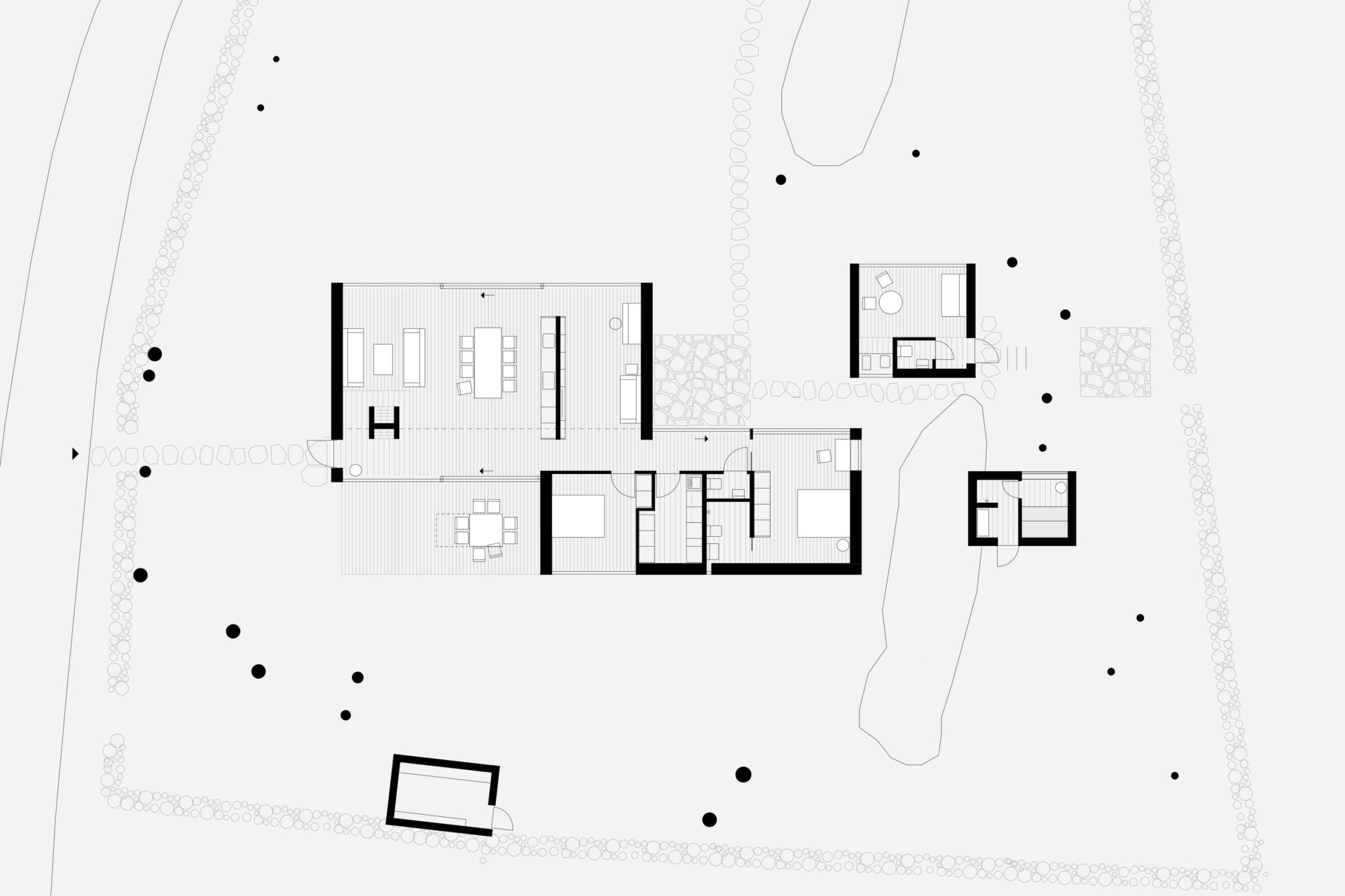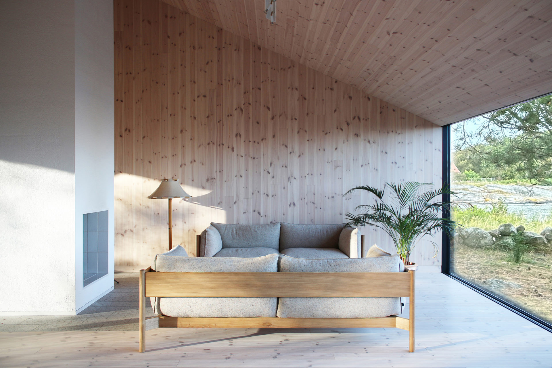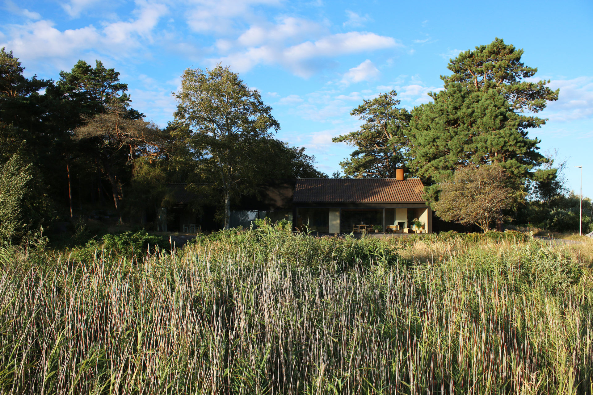 A group of pines that grow with rare force give the place shelter from storms that sweep in regularly. Between the trees, four buildings are placed to seek sun shelter and views with a strategy where outdoor rooms are given equal care as the interior ones. The entrance, living room, kitchen, and terrace form a large transparent space, facing both the sea in the northeast and the evening sun towards the southwest. Serving functions are conversely closed, turned away from the sea. In the quietest position of the house is the master bedroom. The freestanding guesthouse is like a boat, all everyday functions are on a compressed surface independent of the other buildings. At the far end of the plot, in the most secluded location is the sauna. With a foundation on boulders found on site, the building takes a step up into the slightly sloping terrain. Between pines, in the protection of surrounding buildings, it scouts down towards the sea.