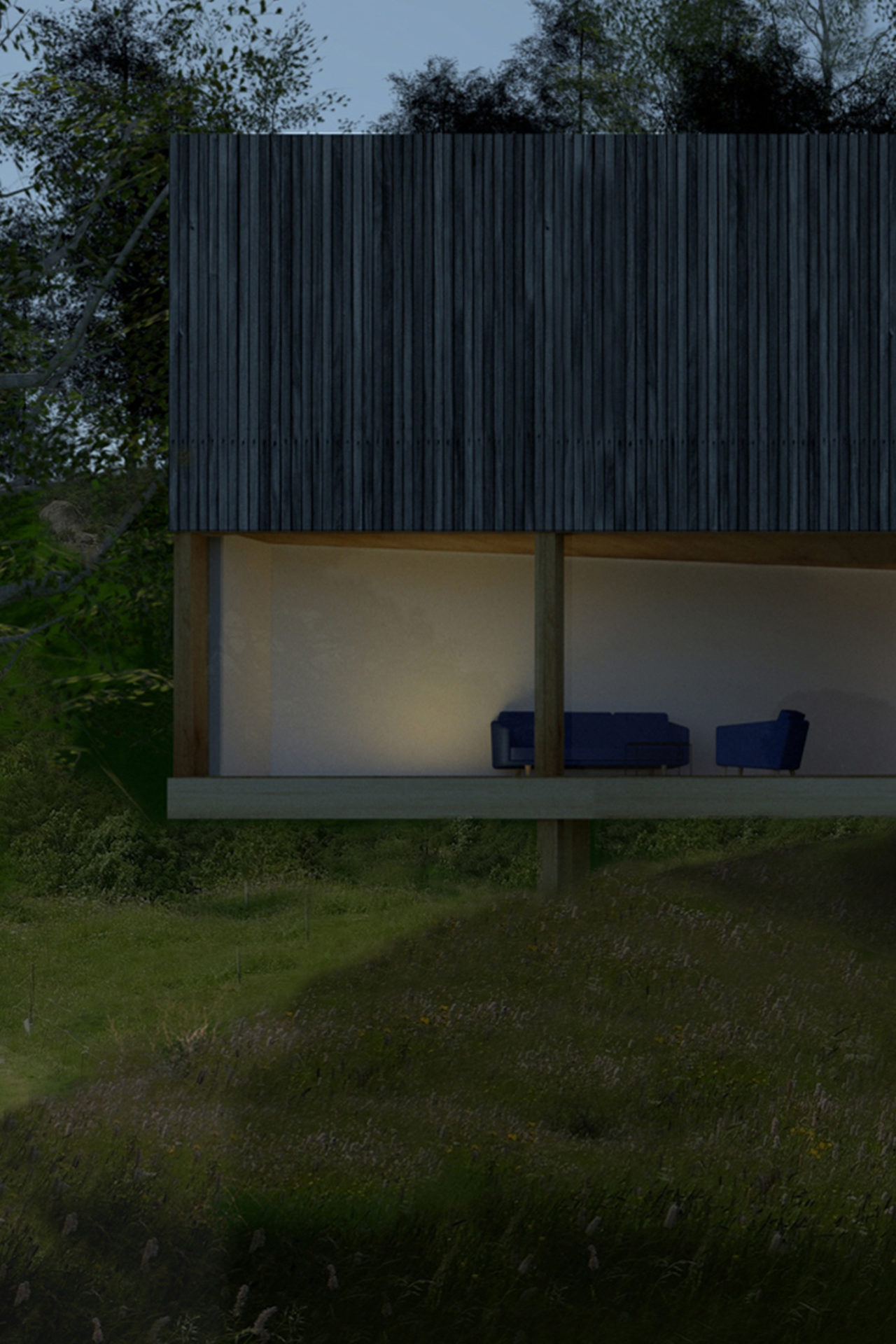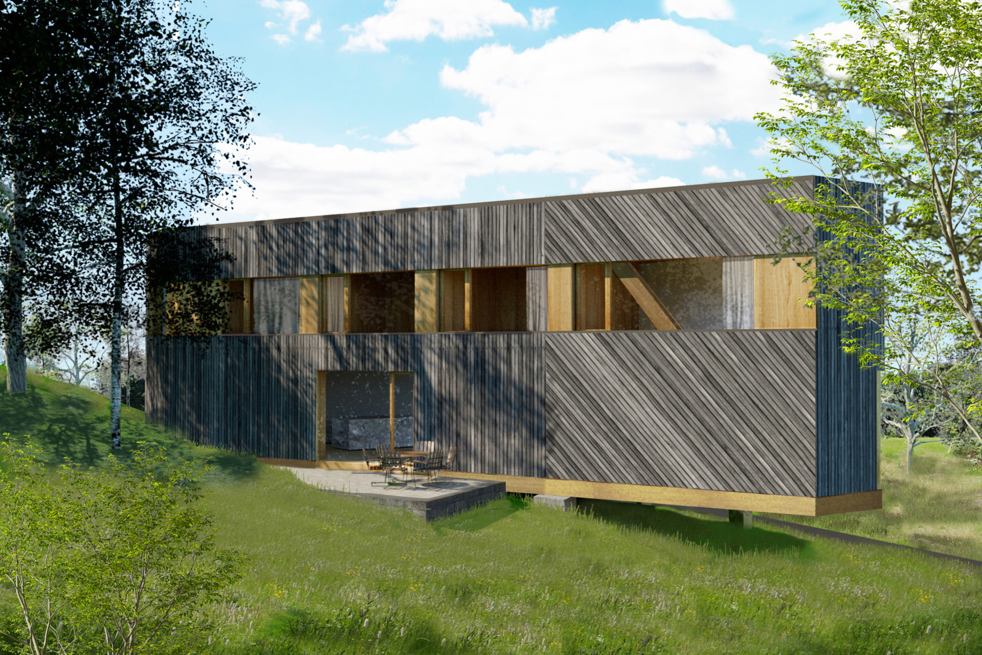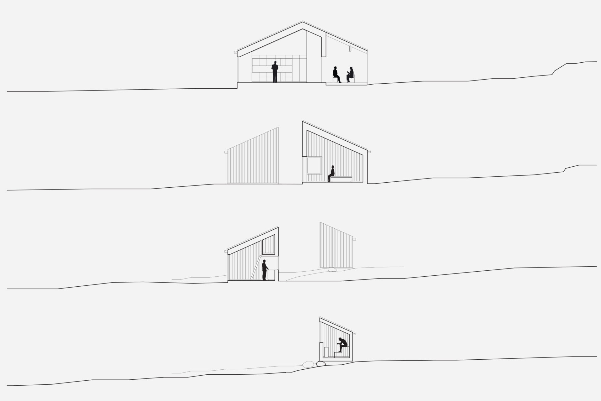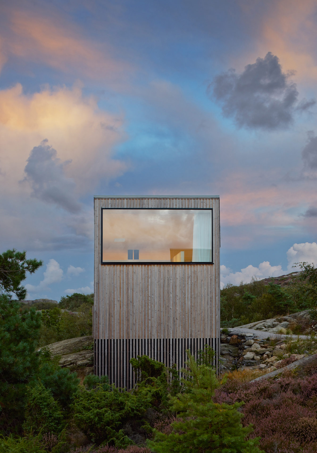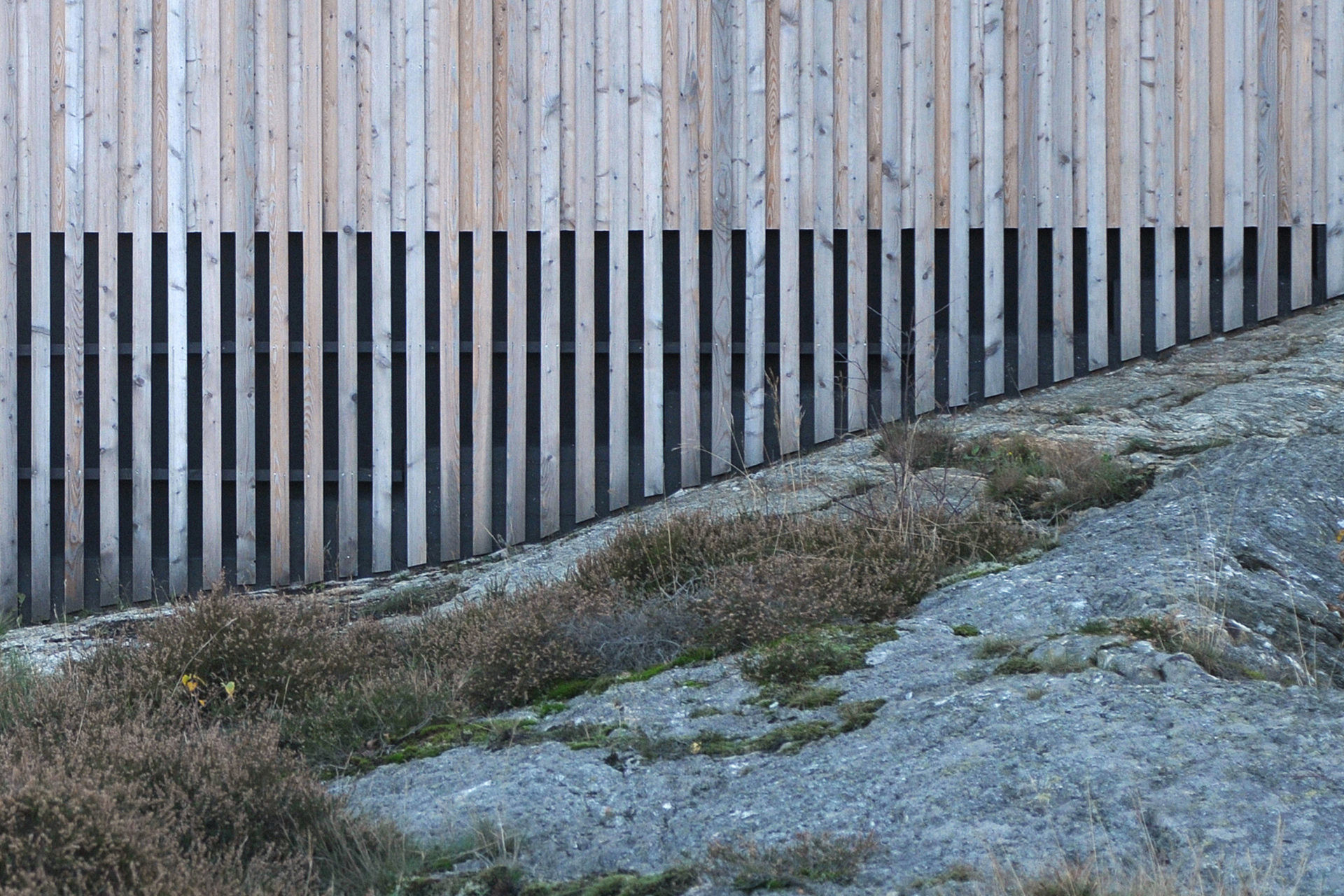 The characteristically barren and hilly terrain was the starting point for our discussion about the location. The possibilities were the deciding factor and the client bought the plot, 1 km from an old fishing settlement and 300 metres from the settlements northern inlet. Two buildings form a pair in a carefully chosen position. The site is up high but not high enough to see the strati from ground level. The terrain and the clients desire for a sea view decided the main building’s section with the upper floor adapted in height to afford a view of the strait. A smaller supplementary building forms a visual barrier towards the neighbours and defines the site boundary. The space between the buildings is taken in possession. The programme is in two parts: the larger house containing kitchen, living room, bedroom and bath and the smaller with two bedrooms for guests. The layout in the main building is based on the idea of gathering around fireplace and vista, an almost primitive layout. The chimney takes the centre point of the building with two fireplaces on top of each other. The living room with the top fireplace on one short side and view on the other, kitchen with the bottom fireplace and view in the opposite direction facing south. The window apertures afford a view of unspoiled nature only. Because of the clients interest in wood, it has been systematically used for structure, facade and interior surfaces. Wood has an unbeatable potential for in situation treatment, which the building’s contact with the ground demonstrates. The facade’s lid passes over the base and is carefully sawn just above the terrain. The buildings respond to the smallest movement and complete our deliberations about the site.