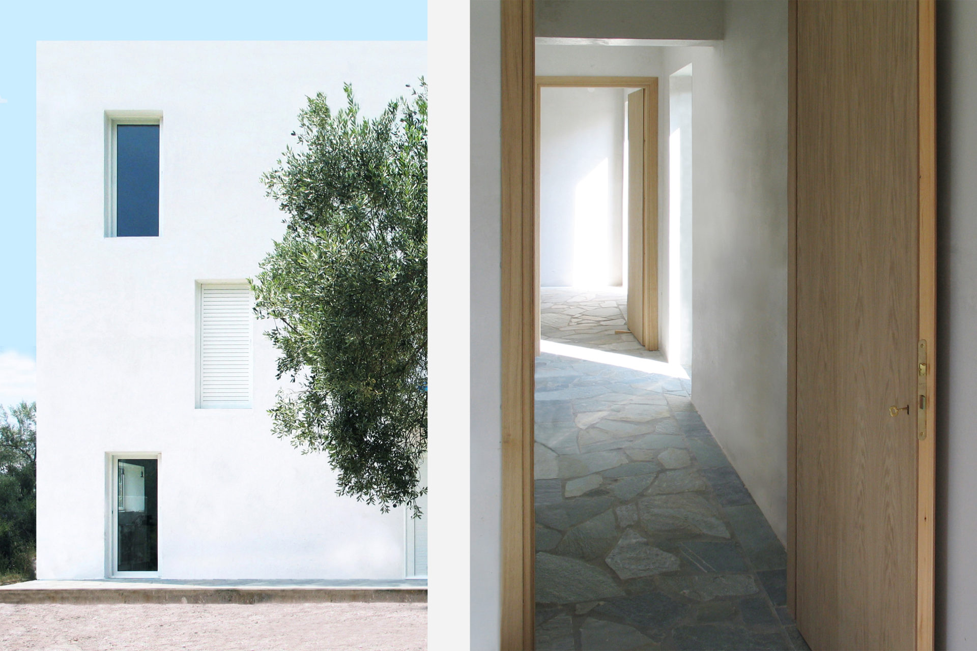 500 year old olive trees, a high ridge next door, and the Aegan Sea nearby, provided a distinct frame. To save trees, a small footprint was required and the result is a vertical building with common rooms on the entrance floor, and bedrooms on two floors above. The whole provides opportunities for family and guests to meet and to retreat in peace and quiet. Living room and kitchen are at ground level completely open towards the garden. Floors 2 and 3 are identical, each have two bedrooms and one bathroom. French balcony windows in opposite walls provide natural cross-ventilation. Despite the climate, mechanical air conditioning is not needed. A roof terrace delivers the finale in the relationship between the rooms and the trees: below, inside and above. Construction methods follow local traditions with cast-in-place concrete, whitewashed brick walls, and green slate floors. The house is a part of the village but stands in its surrounding agricultural landscape creating a gray zone where continued olive harvesting and summer life coexist. (finished during studies, 2002)