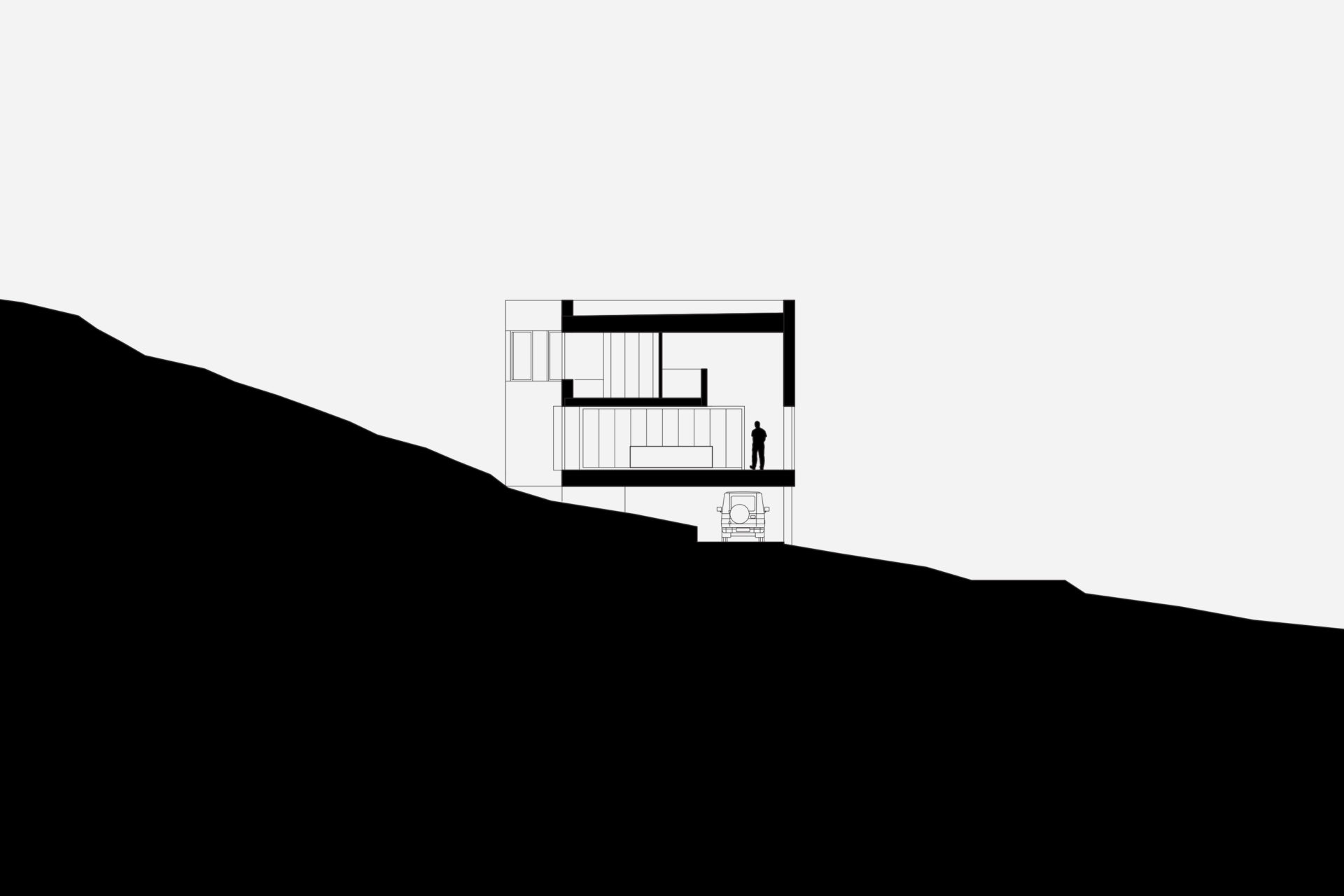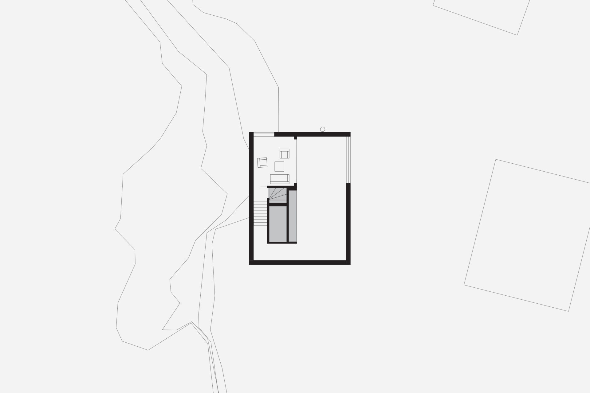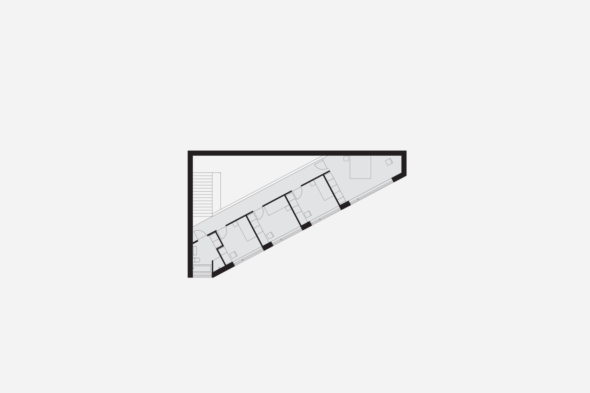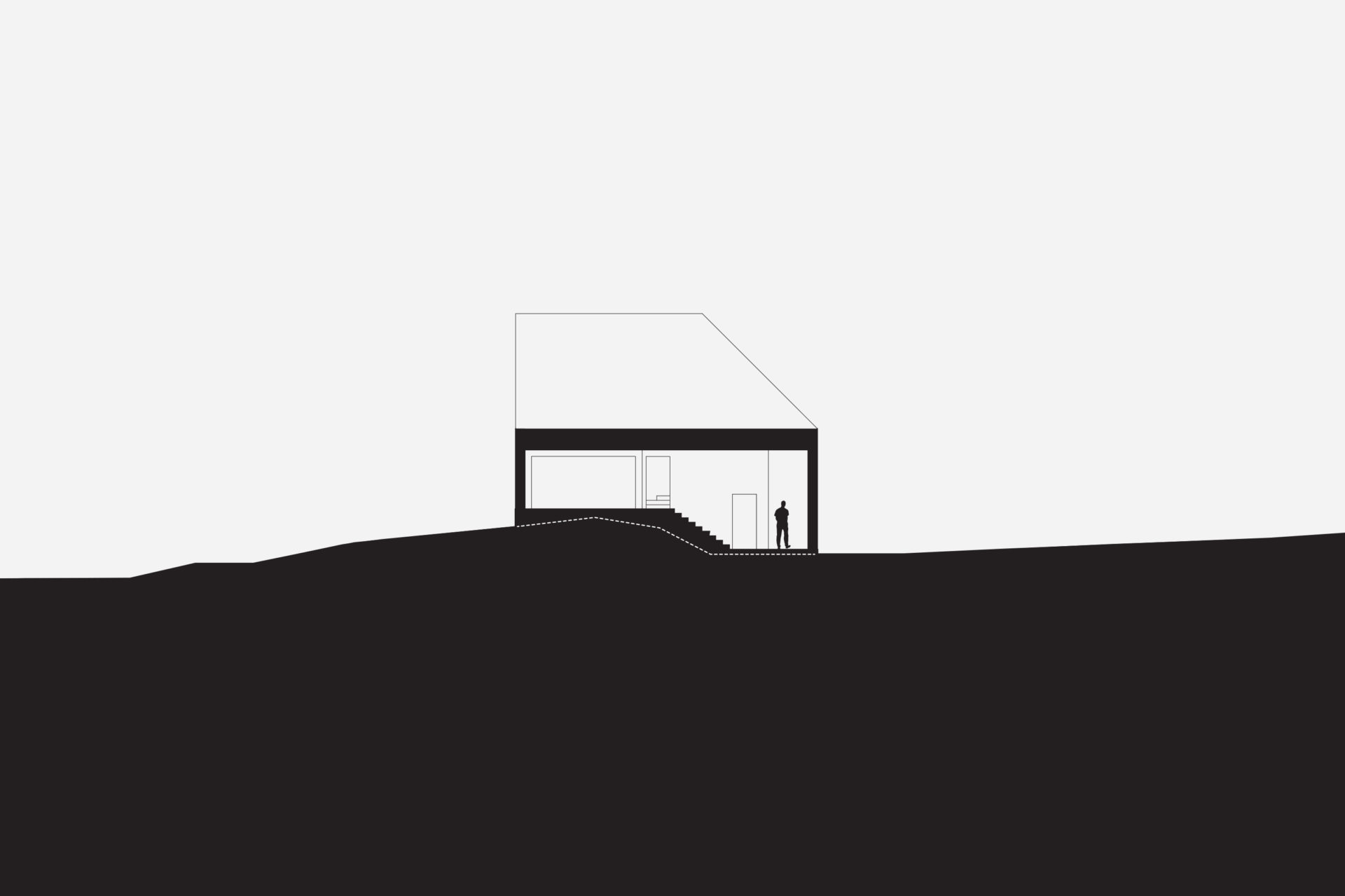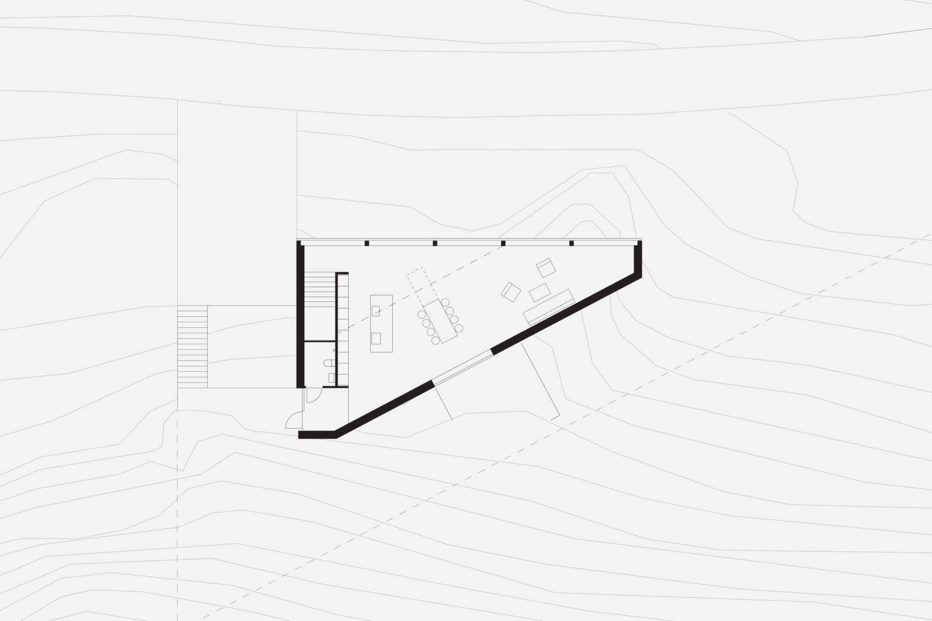 What would be left of a newly built house in 3000 years? If it was built of wood and natural materials, perhaps only the remains of a stone staircase. The site’s 3,000-year-old rock carving from a prehistoric settlement raised these long term concerns as part of the founding strategy for the house. To achieve the greatest possible distance from the remains, the building was placed as far into the plot’s wedge as possible. The triangular property boundary became a mold for the house, and the internal is adapted to the external and the client’s wish for a total area of 200 sqm. With a foundation on pillars, the footprint would be minimal and the terrain in which the rock carvings had survived three millennia would not be lost. A stone staircase follows the slope to the level where the entrance hall naturally connects to the ground. The first floor comprises a large room with kitchen and living room and a window strip towards the entrance road and further on a horizontal landscape. Light conditions in the room vary greatly in relation to its varying depth of 1.5-10 meters. The second floor with four bedrooms and bathroom faces the private mountainside. The repetition of the smaller rooms runs efficiently along the longest side of the building and the complicated triangular shape that´s left is transformed into an asset as a double-height triangular void.