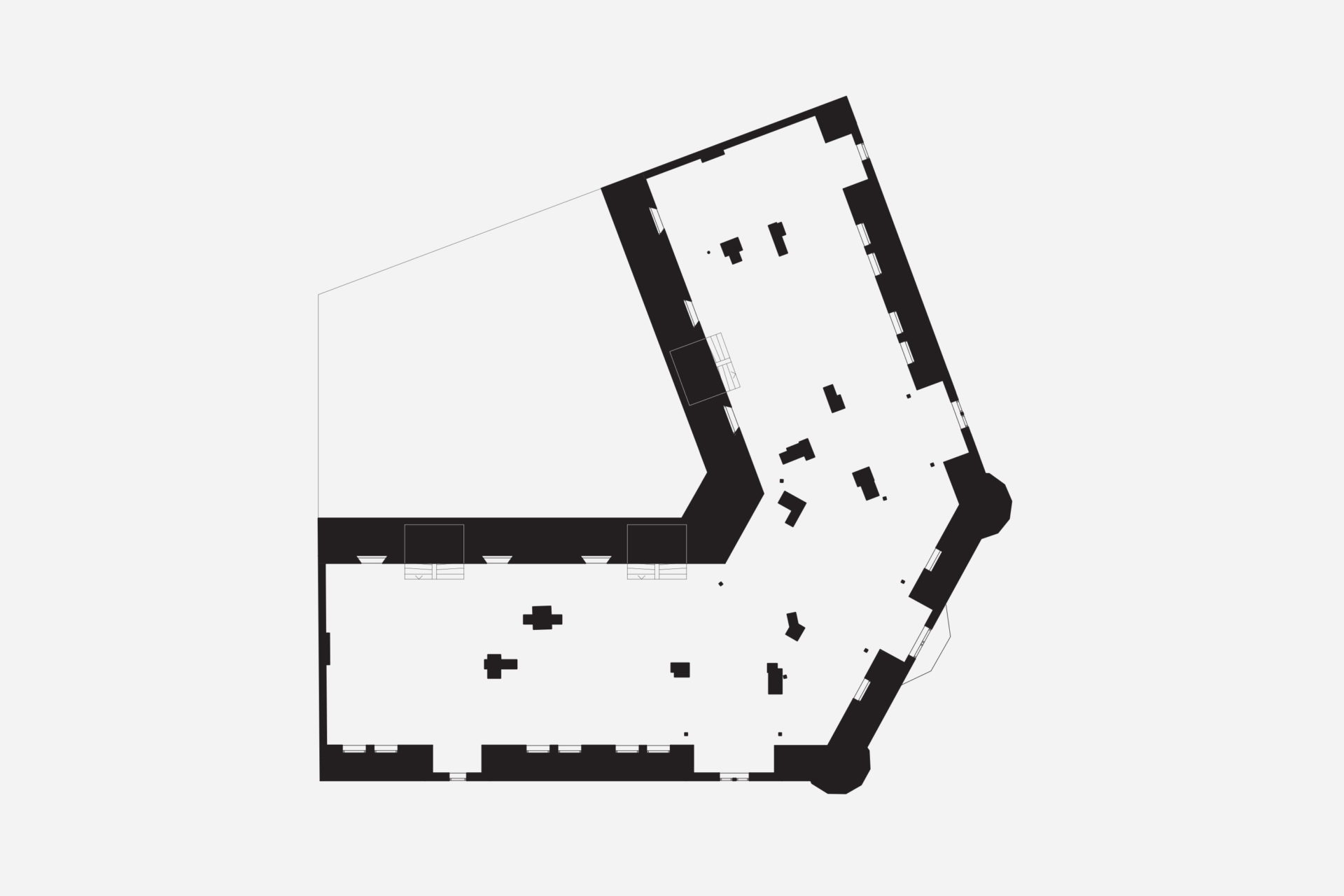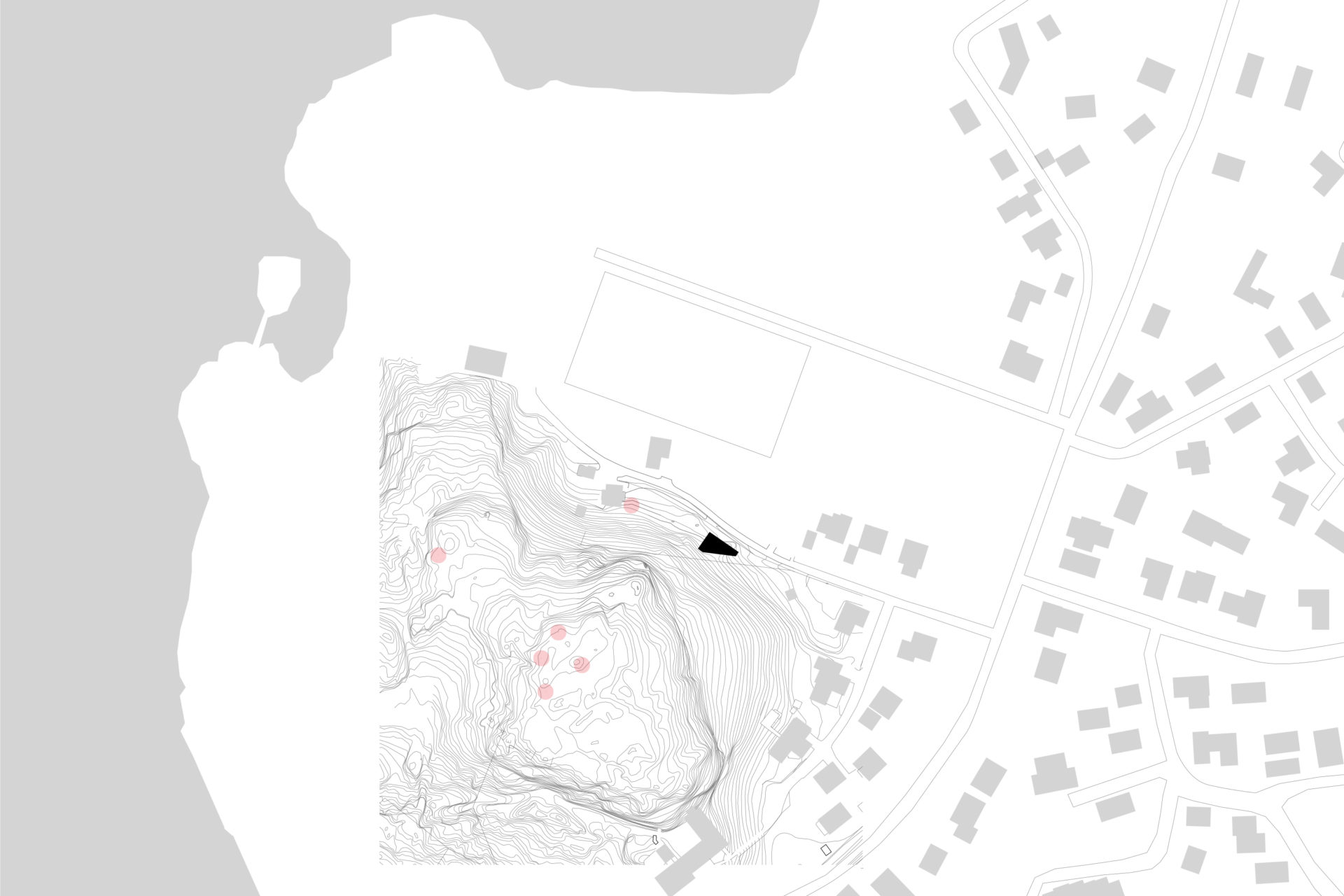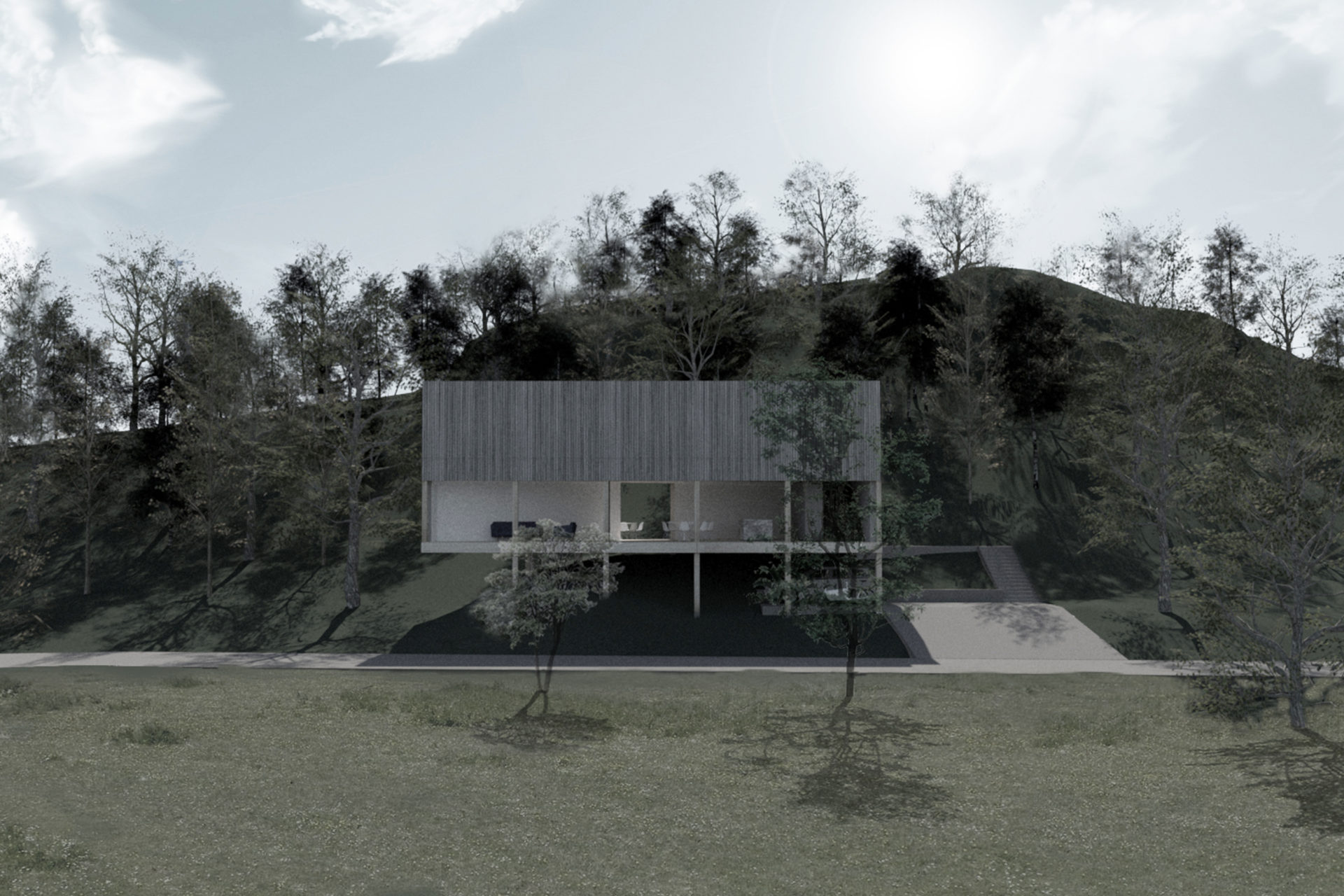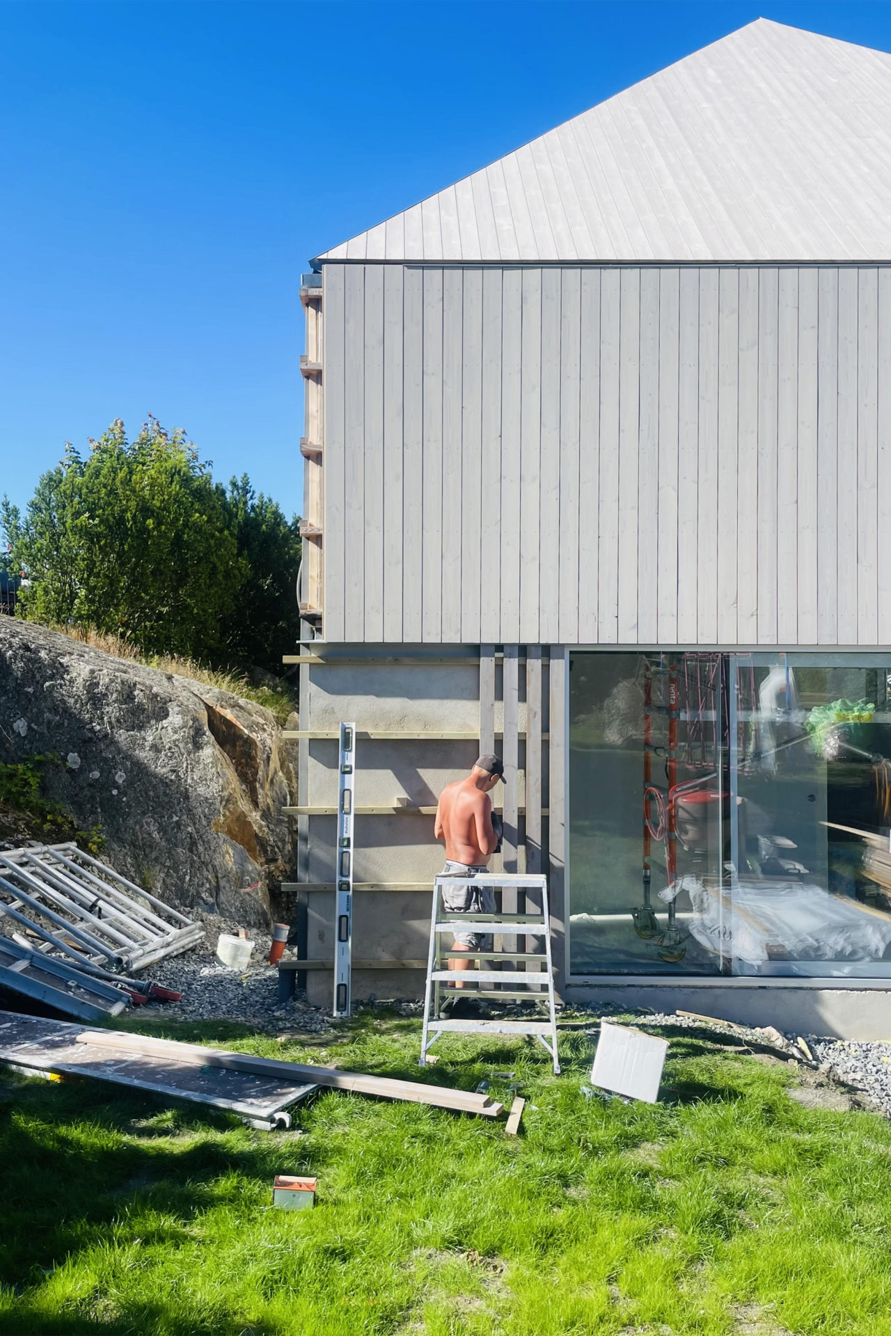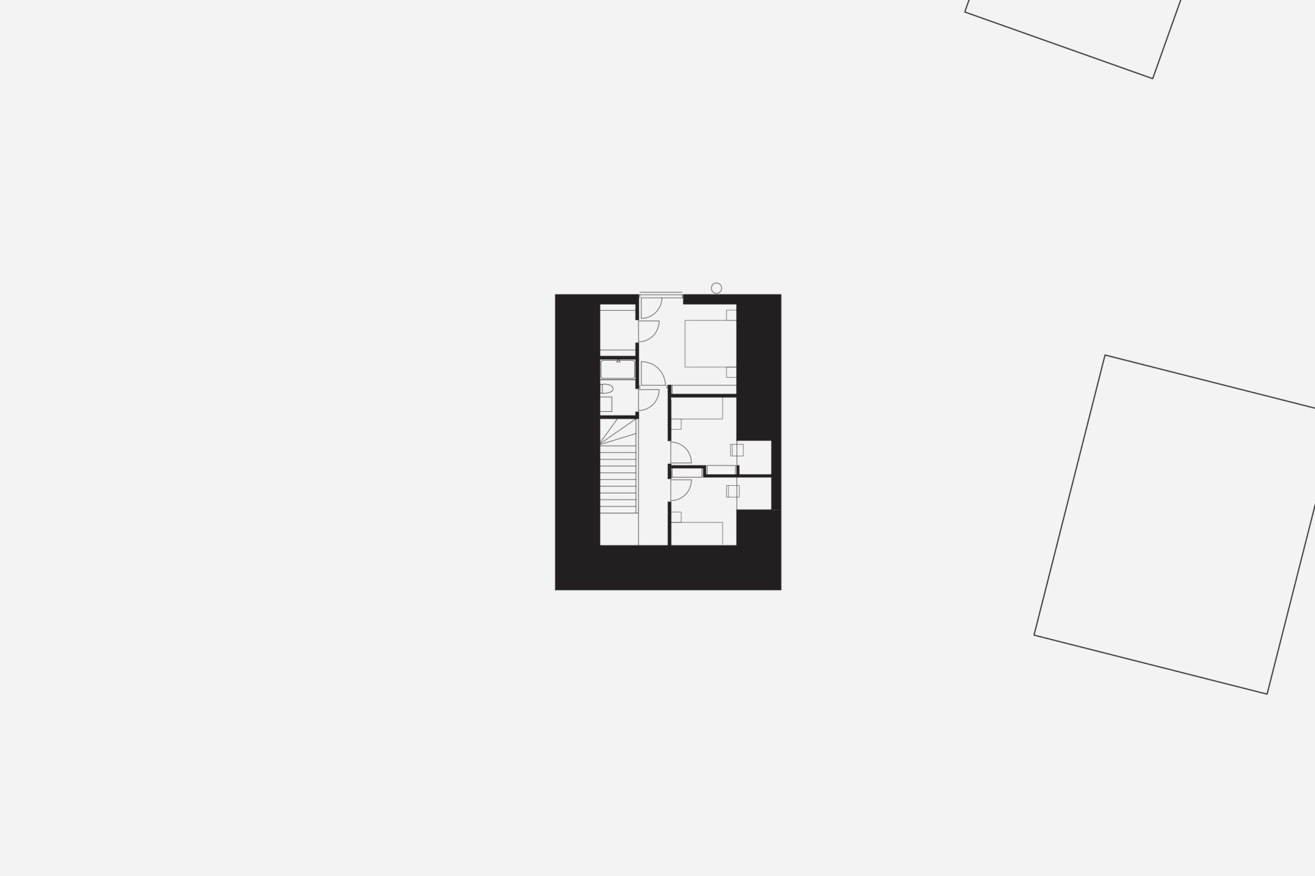 What would be left of a newly built house in 3000 years? If it was built of wood and natural materials, perhaps only the remains of a stone staircase. The site’s 3,000-year-old rock carving from a prehistoric settlement raised these long term concerns as part of the founding strategy for the house. To achieve the greatest possible distance from the remains, the building was placed as far into the plot’s wedge as possible. The triangular property boundary became a mold for the house, and the internal is adapted to the external and the client’s wish for a total area of 200 sqm. With a foundation on pillars, the footprint would be minimal and the terrain in which the rock carvings had survived three millennia would not be lost. A stone staircase follows the slope to the level where the entrance hall naturally connects to the ground. The first floor comprises a large room with kitchen and living room and a window strip towards the entrance road and further on a horizontal landscape. Light conditions in the room vary greatly in relation to its varying depth of 1.5-10 meters. The second floor with four bedrooms and bathroom faces the private mountainside. The repetition of the smaller rooms runs efficiently along the longest side of the building and the complicated triangular shape that´s left is transformed into an asset as a double-height triangular void.
