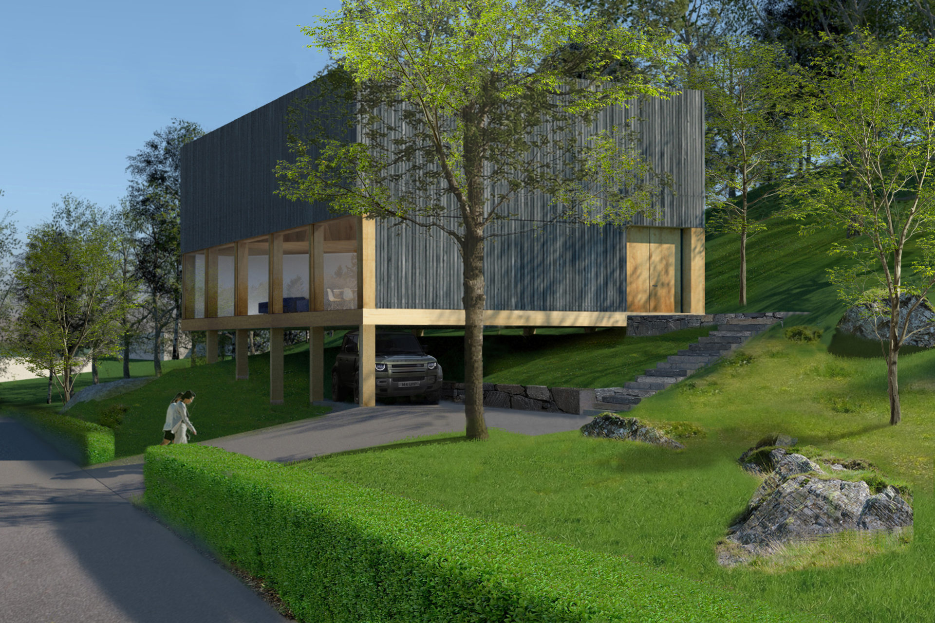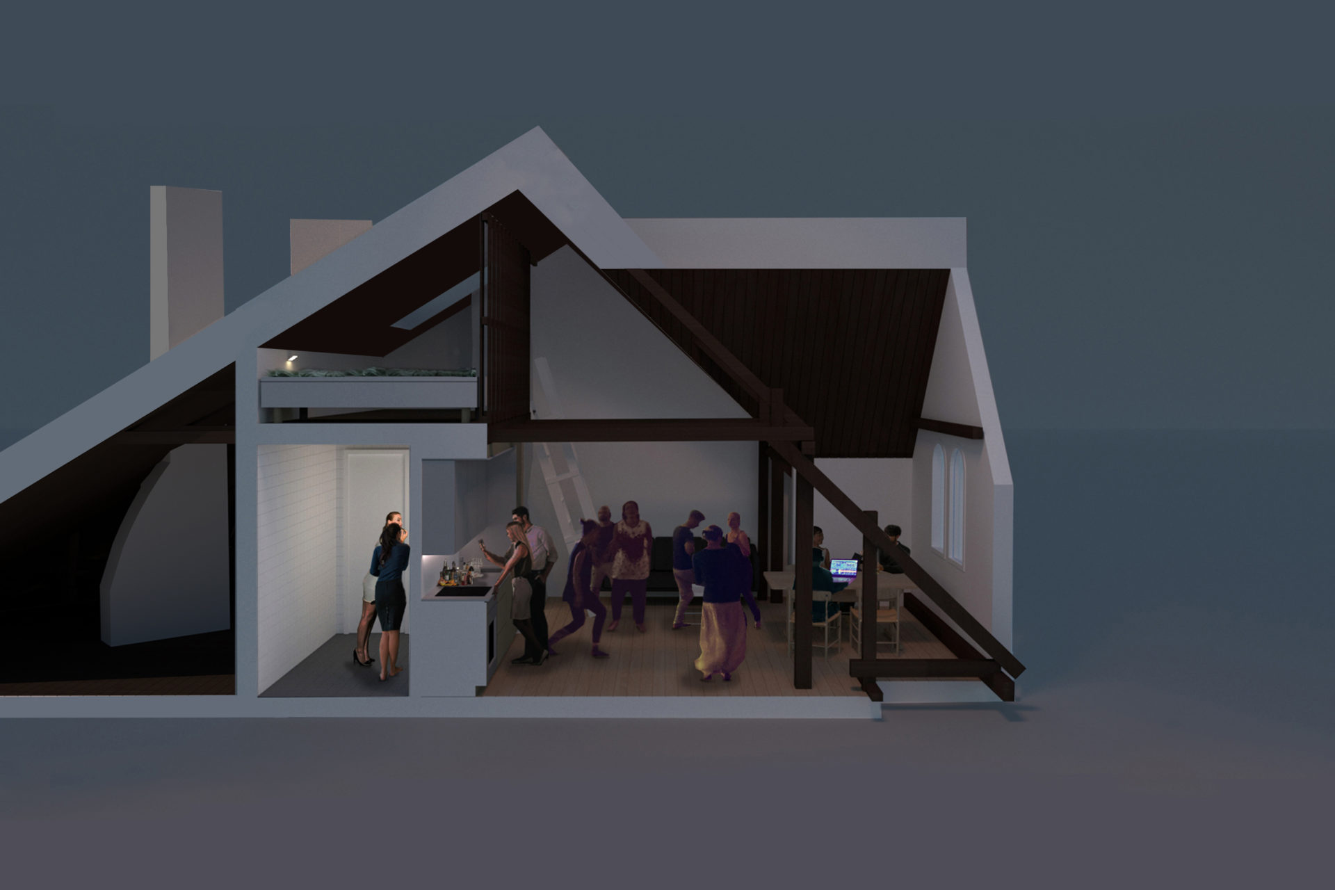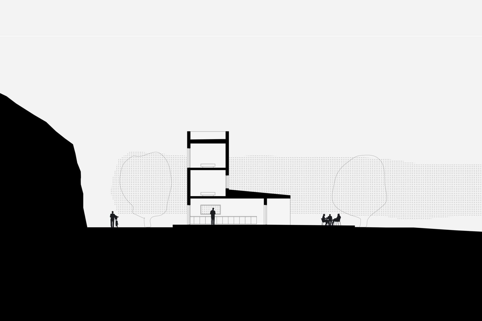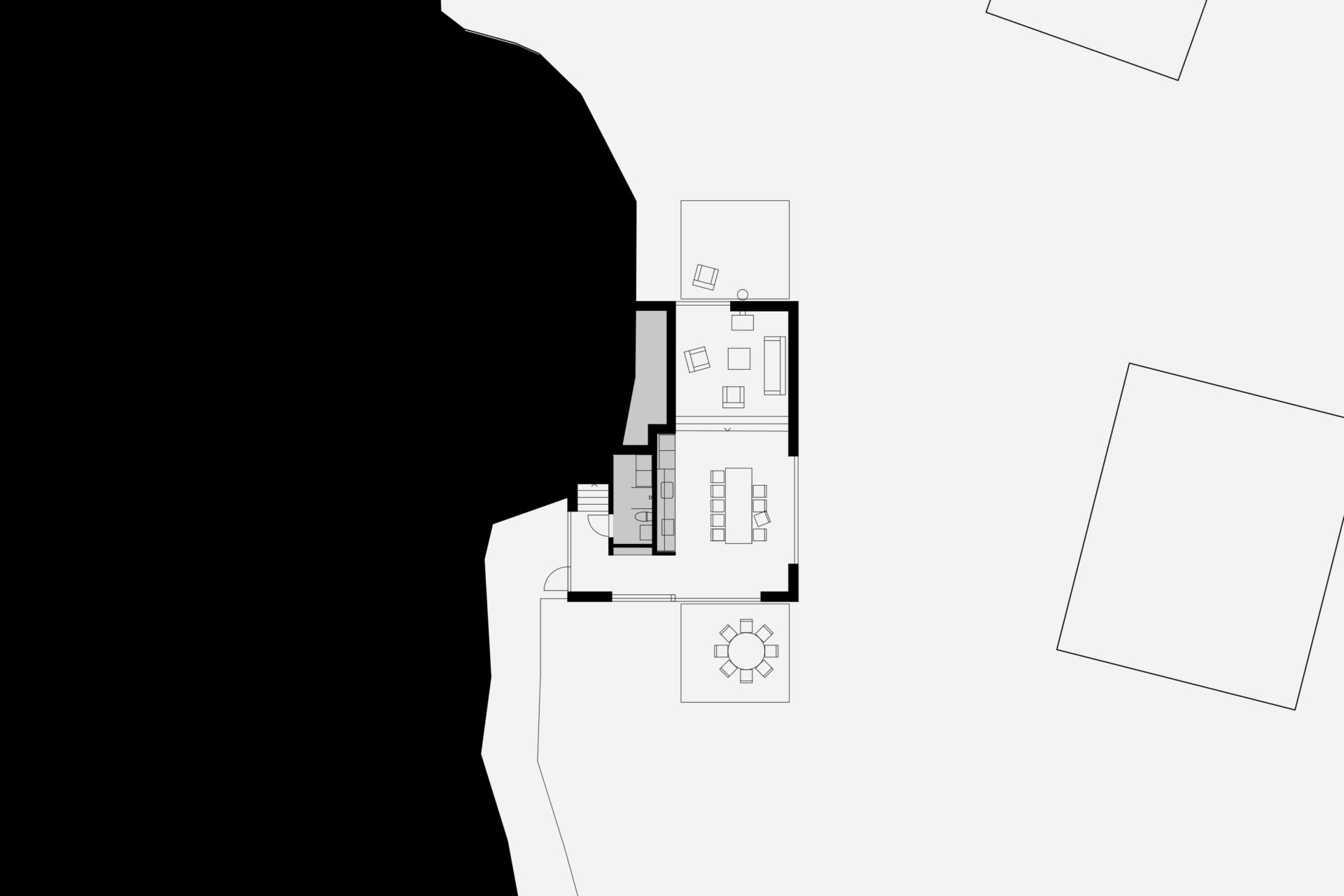The house is located on the border between a flatter lower landscape and an elongated higher ridge. Like coarse pixels, the rooms on the ground floor are adapted to the plot’s high-resolution topography. Different functions are at different heights, but within the same space. The living room is at the bottom. On an intermediate level are the kitchen, entrance hall and bathroom. On an upper level, overlooking the nearest bay is the library/ guest room. With a ceiling at a constant level and floors at different levels, the room height varies greatly. The common functions naturally have the highest room height, and the adapted heights of the floor levels provide direct connections to the outside entrance area and terraces. The bright interior of the living room and kitchen and large varied openings towards three directions compensate for dark winter months based on the client’s partly southern European origins and longing for light. The top floor is another world. Separated from the other functions are three bedrooms and a bathroom arranged under a steep gabled roof, which provides typically cozy attic rooms. Wood is used consistently in frames, facades, and roof.